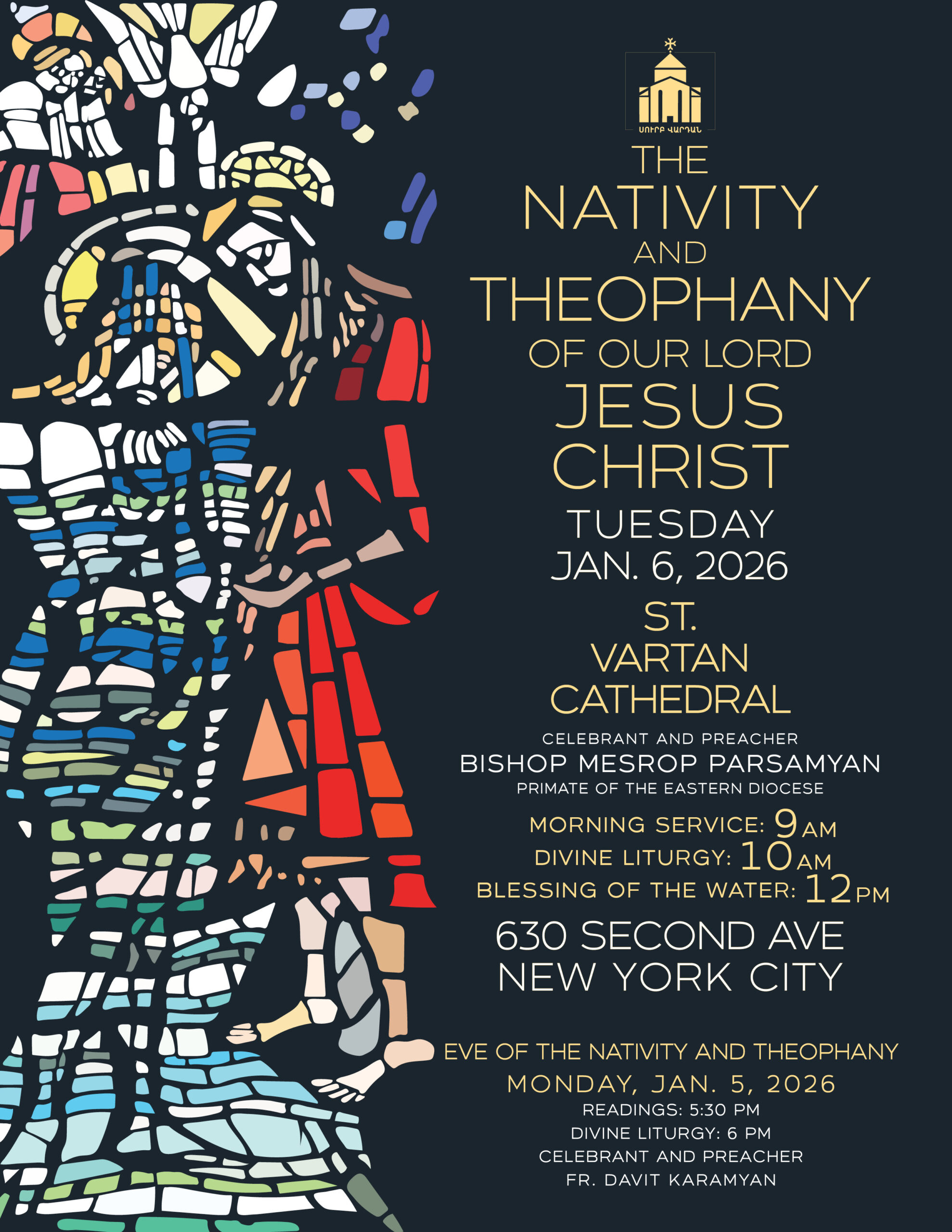 On Tuesday, January 6—the Feast of the Nativity and Theophany of Our Lord Jesus Christ—the Divine Liturgy will be celebrated by Bishop Mesrop Parsamyan, Primate of the Eastern Diocese, who will also deliver the homily.