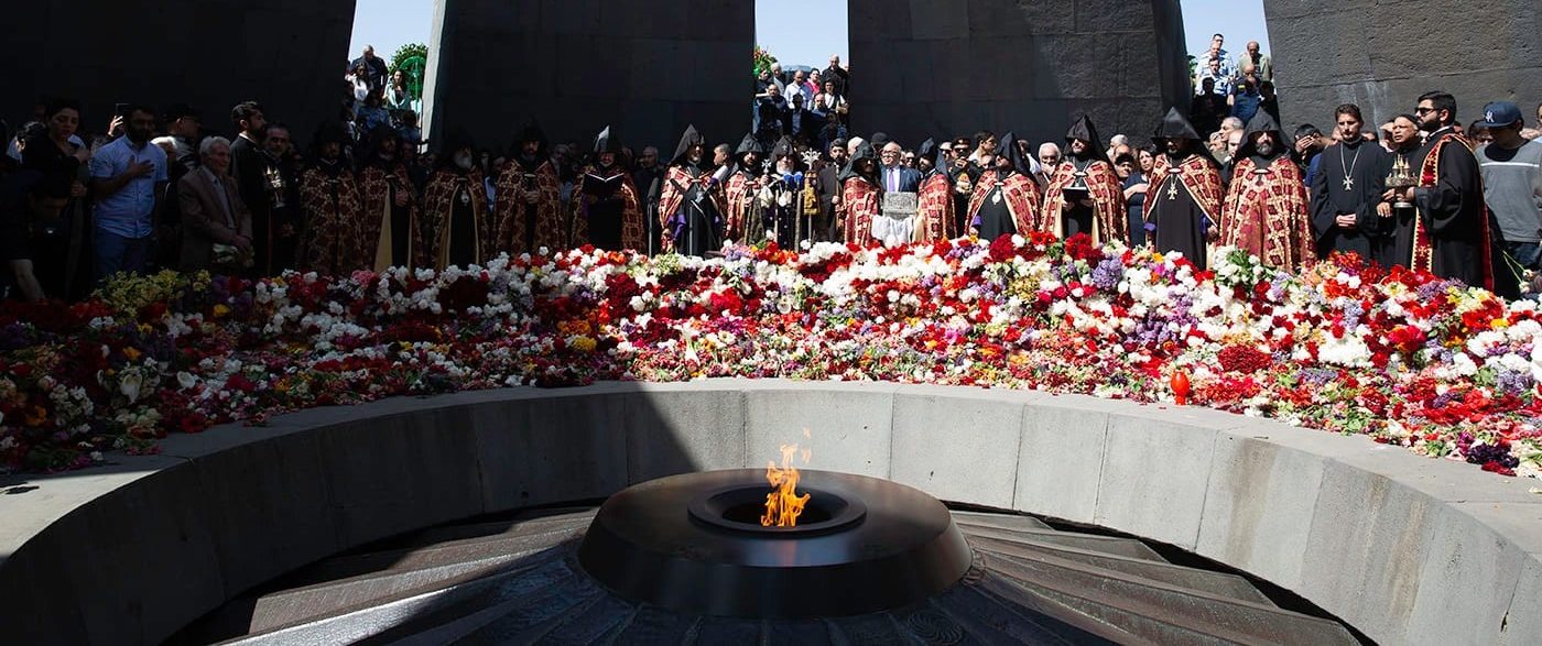 His Holiness Karekin II began this year’s solemn April 24 commemoration by visiting the Armenian Genocide Memorial at Dzidzernagapert, to lay wreaths and offer prayers at the eternal flame.