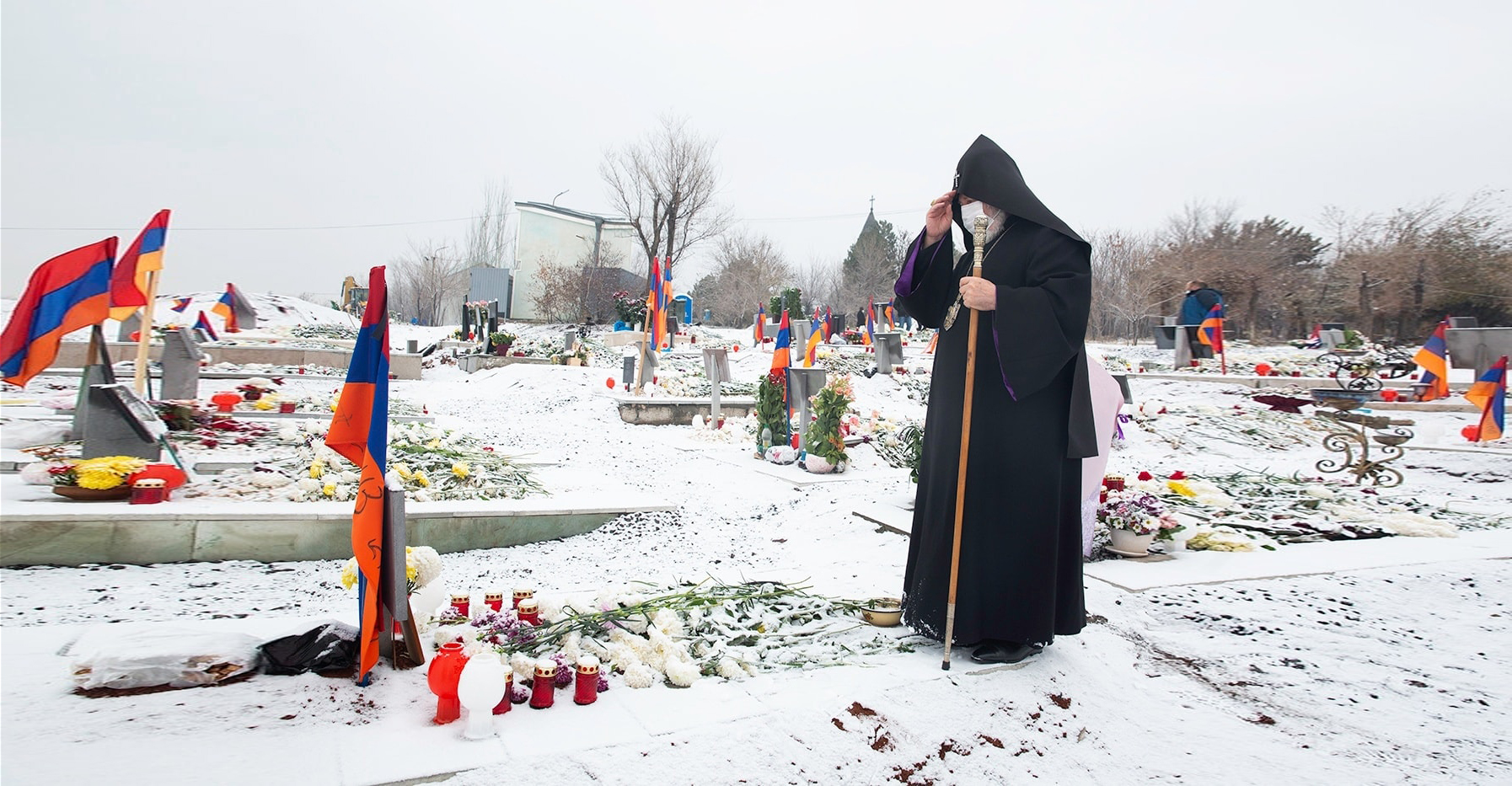 At Yerablur Military Cemetery, Catholicos Karekin II Prays for the Martyred Heroes of the Arstakh War