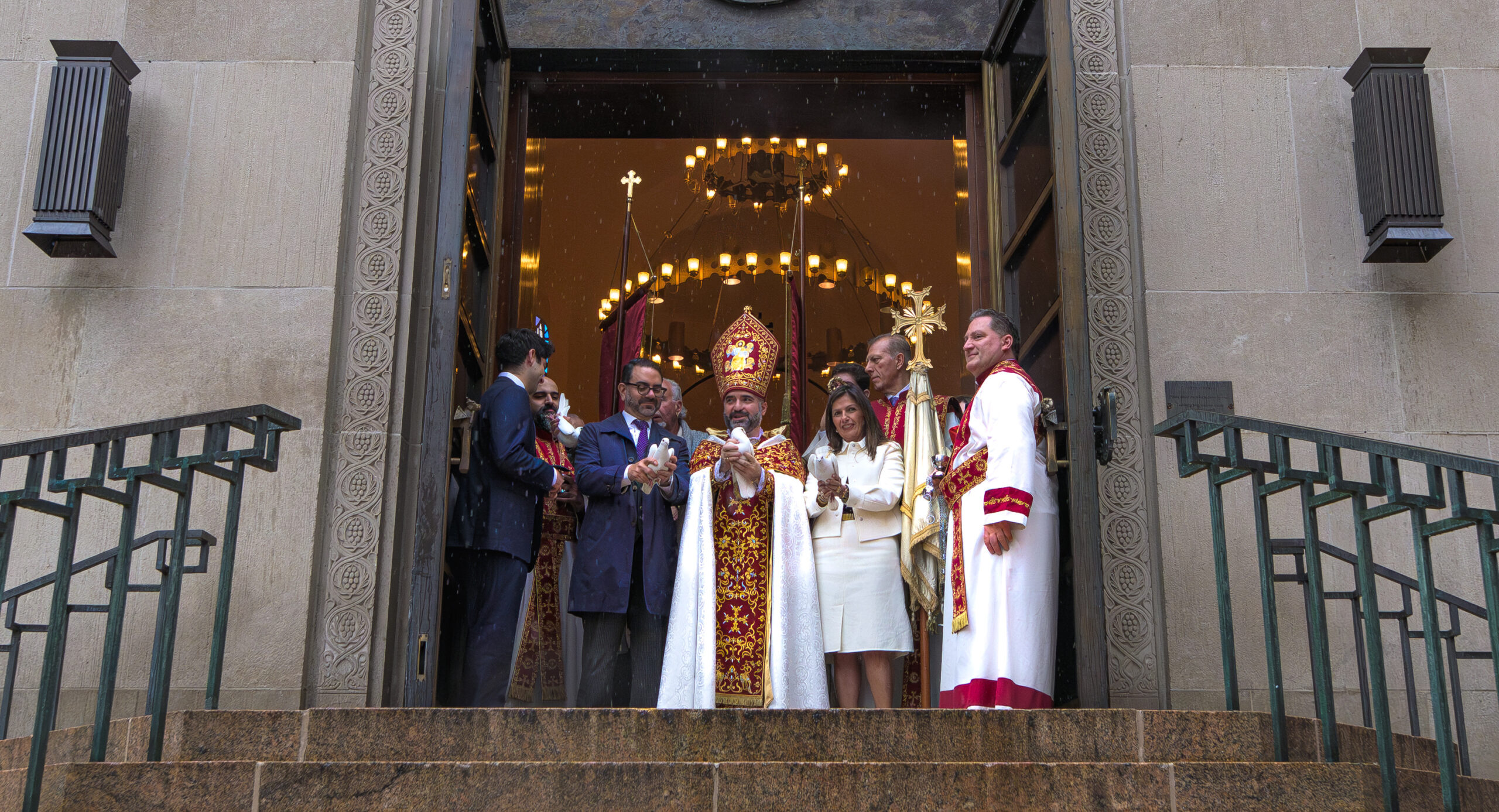 At the conclusion of the service, despite a gentle rain falling outside, a procession of clergy and faithful made their way to the bronze entrance doors for the “Release of Doves” ceremony. Though the weather softened the usual pageantry, it did not diminish the meaning of the moment, which symbolizes Christ sending forth His apostles into the world to preach the Gospel. This special ceremony remains a beloved, decades-long Easter tradition at St. Vartan Armenian Cathedral, its spirit enduring regardless of grey skies above.
