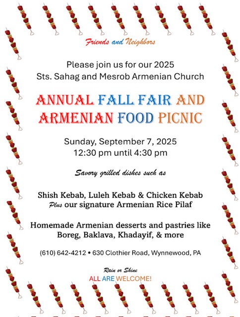 St. Sahag & St. Mesrob Church of Wynnewood, PA, will hold its annual Armenian Food Festival on Sunday, Sep. 7, 12:30-4:30 p.m., on the church grounds (630 Clothier Rd., Wynnewood). Enjoy Armenian cuisine, live music, activities & fun for children. Rain or shine. For information call (610) 642-4212. To view a flyer, click here.