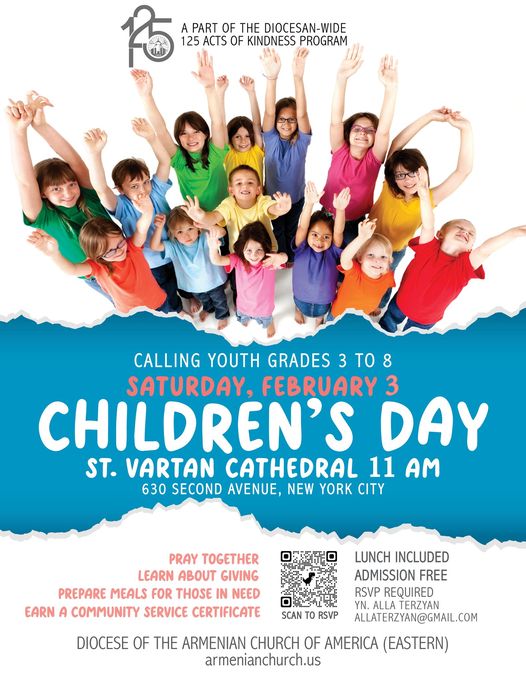 St. Vartan Armenian Cathedral will host a Children’s Day on Saturday, Feb. 3, 2024, starting at 11 a.m. Inviting all Armenian youth Grades 3 to 8 for a day of activities, worship, and a community service project. Admission is free, but RSVP is required: contact allaterzyan@gmail.com. Part of the Diocese’s 125th Anniversary celebration; learn more at armenianchurch.us/125. St. Vartan Cathedral is located at 630 Second Avenue (corner of 34th Street), New York City. Click the link to view a flyer.