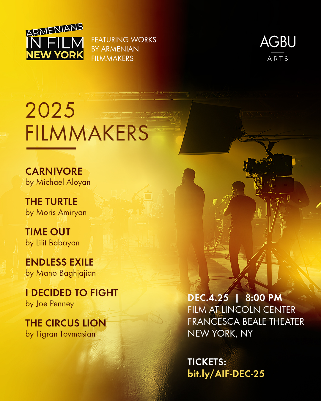 AGBU Arts will present “Armenians in Film New York,” on Thursday, Dec. 4, at 8 p.m., at Film at Lincoln Center (Francesca Beale Theater, 144 W. 65th St., New York City). The screening will feature six short films by Armenian filmmakers Mano Baghjajian, Michael Aloyan, Moris Amiryan, Lilit Babayan, Joe Penney, and Tigran Tovmasian. Moderated by award-winning actor Vache Tovmasyan (Garnik in Anora). Click here to learn more and purchase tickets. To view a flyer with information, click here.