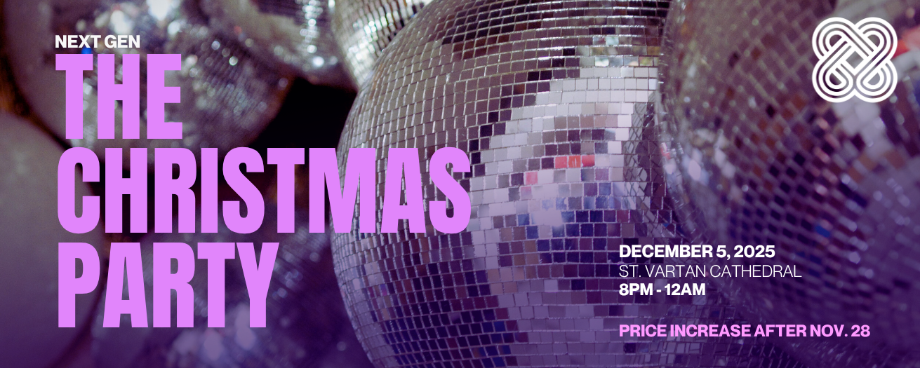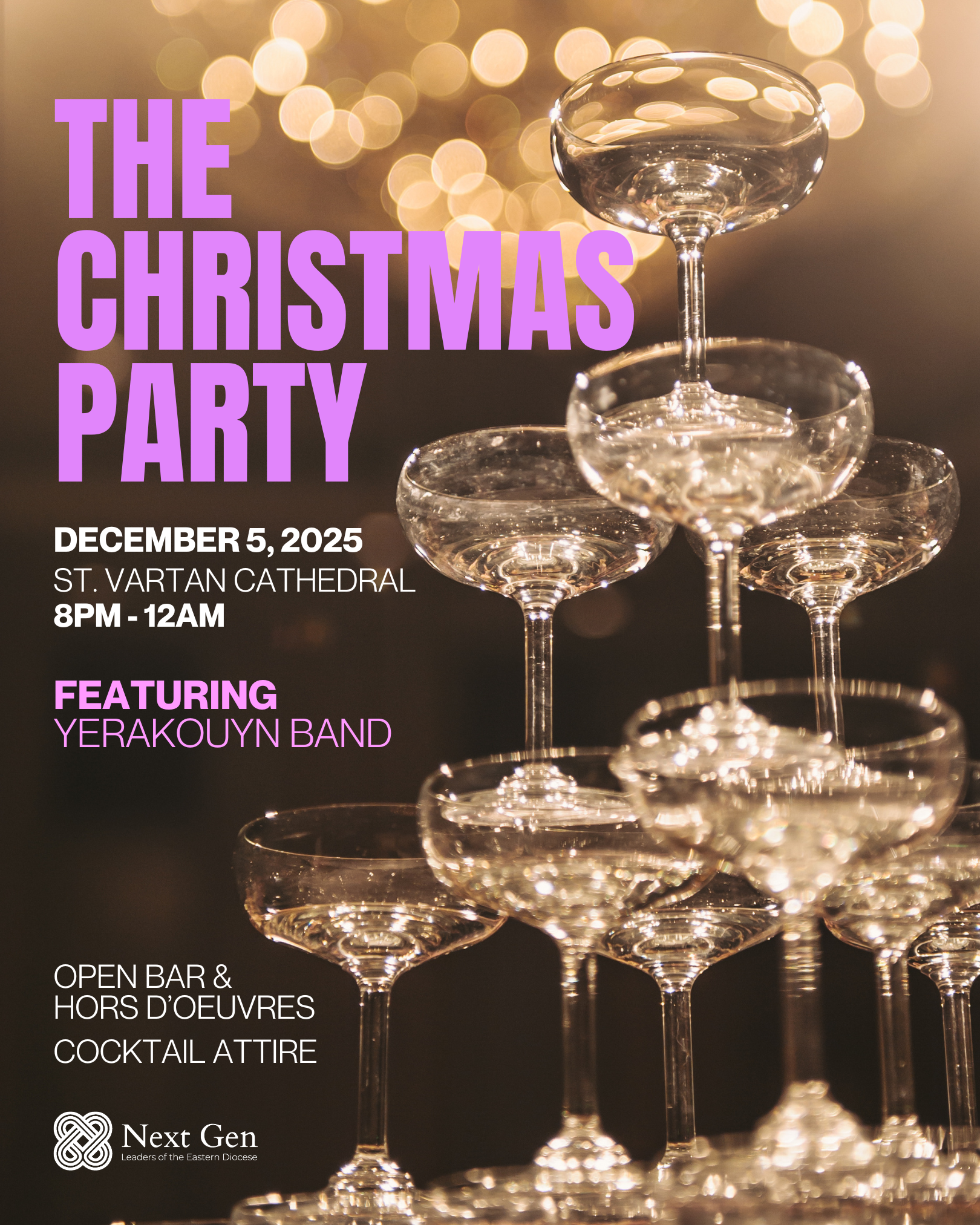 Join the Next Gen Leaders of the Eastern Diocese for a magical night of holiday cheer on Friday, December 5, from 8 p.m. to midnight, at St. Vartan Cathedral’s Haik and Alice Kavookjian Auditorium! Enjoy delicious food and live entertainment by the Yerakouyn Band, along with a DJ to keep the celebration going. It’s going to be the start of a new annual tradition—and a Christmas experience you won’t want to miss! Early bird tickets are on sale now—but prices will go up after November 28. Don’t wait; secure your spot today before tickets sell out. St. Vartan Cathedral is located at 630 Second Avenue (corner of 35th Street), New York City. Click the following links to purchase your tickets and view the event flyer.