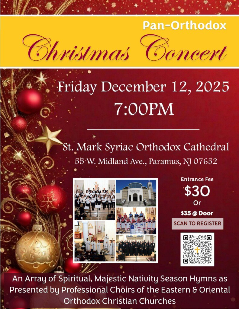 The annual “Pan-Orthodox Christmas Concert” will take place on Friday, Dec. 12, at 7 p.m., at St. Mark Syriac Orthodox Cathedral in Paramus, NJ (55 W. Midland Ave., Paramus). Hear the majestic spiritual music of the Nativity season, presented by choirs of the Eastern and Oriental Orthodox churches—including the Eastern Diocese’s Gomidas Choir, under the direction of Maestro Kris Kalfayan. Diocesan Primate Bishop Mesrop Parsamyan will be among the church leaders in attendance, along with clergy of area Armenian and sister churches. Organized by the Assembly of Canonical Orthodox Bishops of America and the Standing Conference of Oriental Orthodox Hierarchs. Click here (or scan the QR code on the flyer) to register and purchase tickets. Click here to view the flyer.
