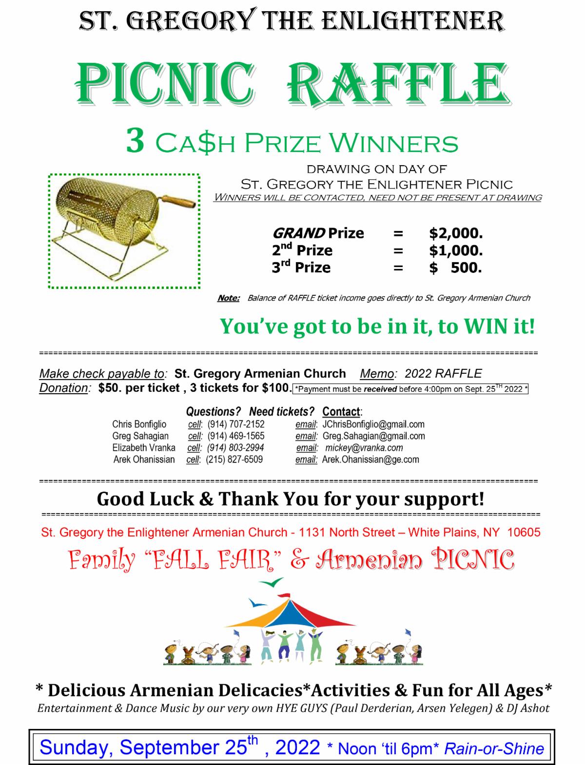 St. Gregory the Enlightener Church in White Plains, NY, will hold its annual picnic and “Family Fair” on Sunday, Sep. 25, from noon until 6 p.m., rain or shine, at the church (1131 North St., White Plains; Exit 25 on Hutchinson R. Pkwy.). Music by Paul Berberian (oud), Armen Yelegen (dumbek), DJ Ashot Soghomonyan. Homemade Armenian cuisine; games, sports, and prizes for kids. 50/50 raffle. For information call (914) 428-2595; click the links to view a flyer, sponsorship form, and raffle circular.