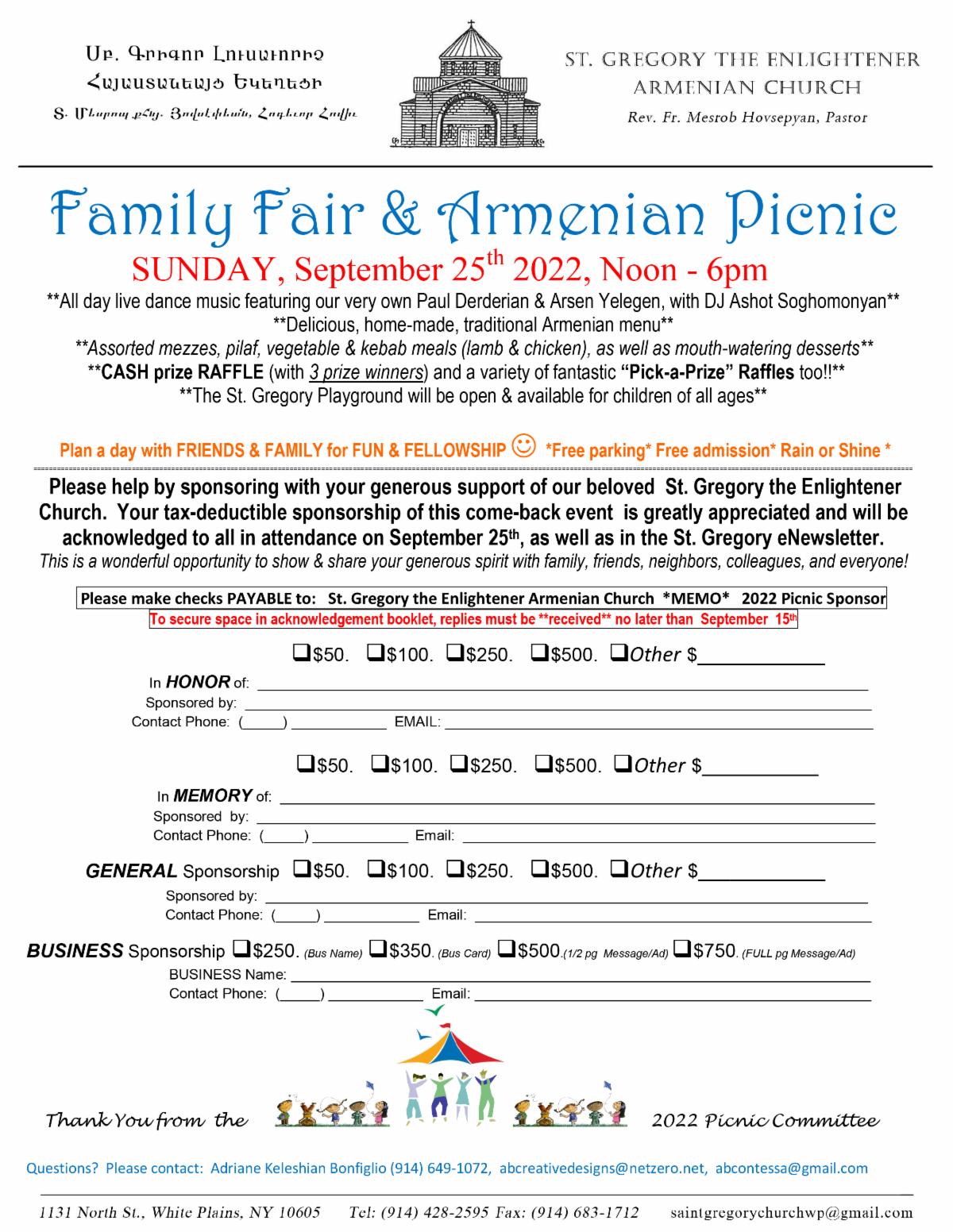 IN-PERSON EVENT: St. Gregory the Enlightener Church Picnic (White Plains, NY)