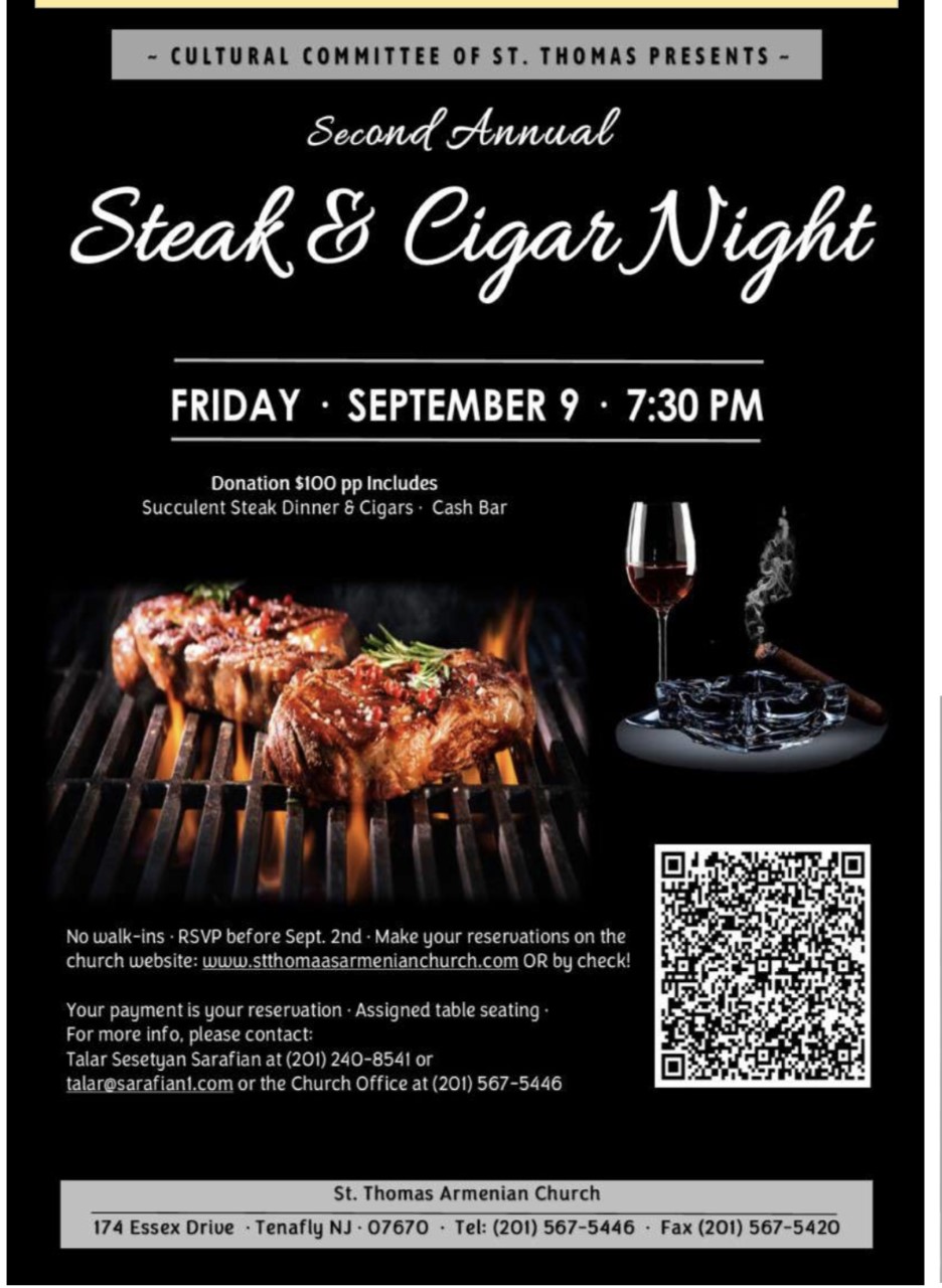 The Cultural Committee of St. Thomas Church (Tenafly, NJ) will hold its 2nd annual “Steak and Cigar Night” on Friday, Sep. 9, at 7:30 p.m., at the church facility (174 Essex Drive, Tenafly). Reservations (required) by Sep. 2; click the link to reserve on the parish website. To view a flyer with contact and additional information, click here.