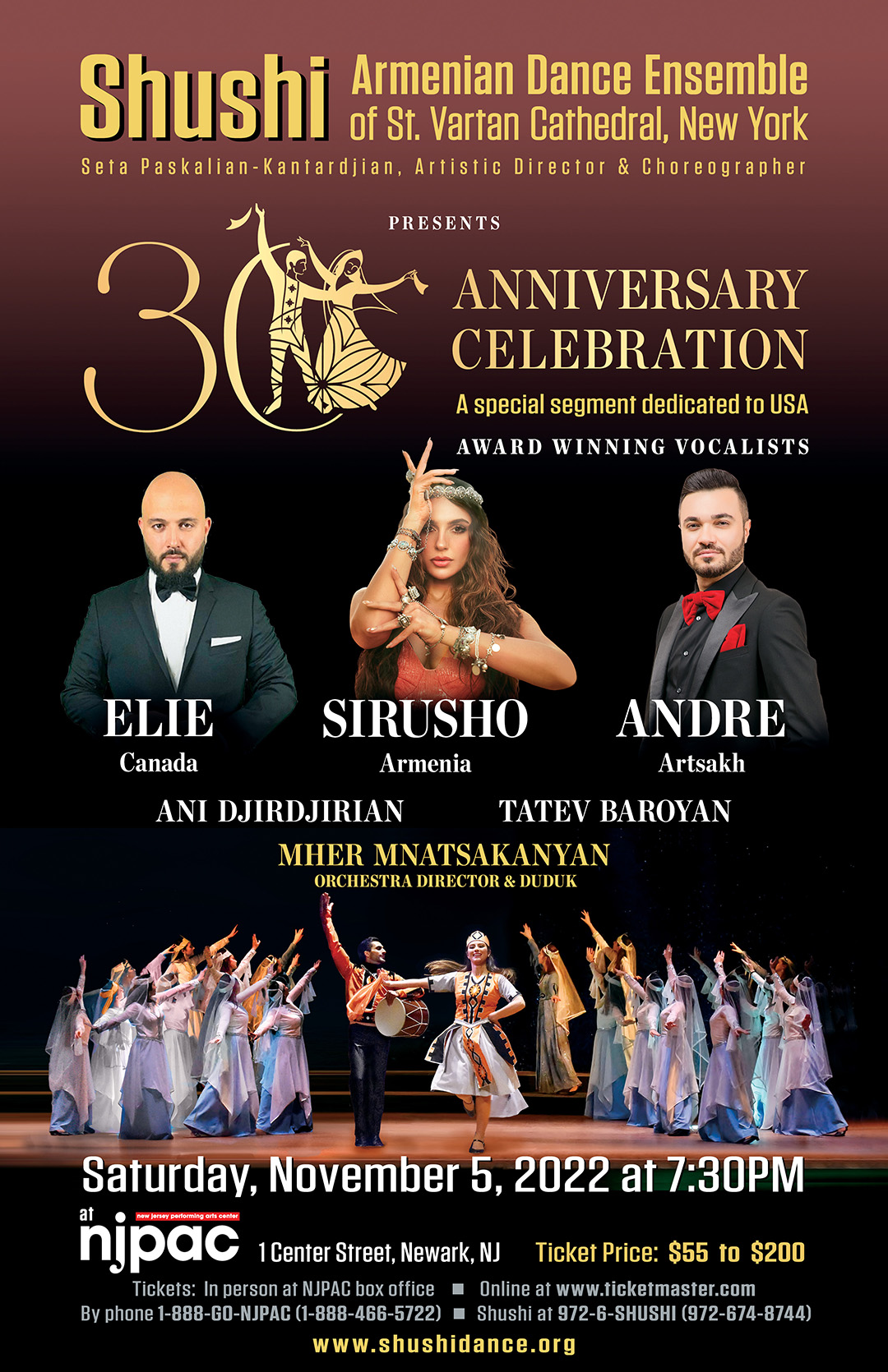 The Shushi Armenian Dance Ensemble of St. Vartan Cathedral of New York will celebrate its 30th anniversary on Saturday, Nov. 5, at 7:30 p.m., with a performance at the New Jersey Performing Arts Center (NJPAC) in Newark, NJ. For this exceptional event, the Shushi Ensemble will be joined by award-winning Armenian artists from Armenia, Artsakh and Canada—including Sirusho, Andre, and Elie Berberian—in a showcase of patriotic songs and dance. Under the direction and choreography of Seta Paskalian-Kantardjian. For tickets call (972) 674-8744. Click here to view a flyer.