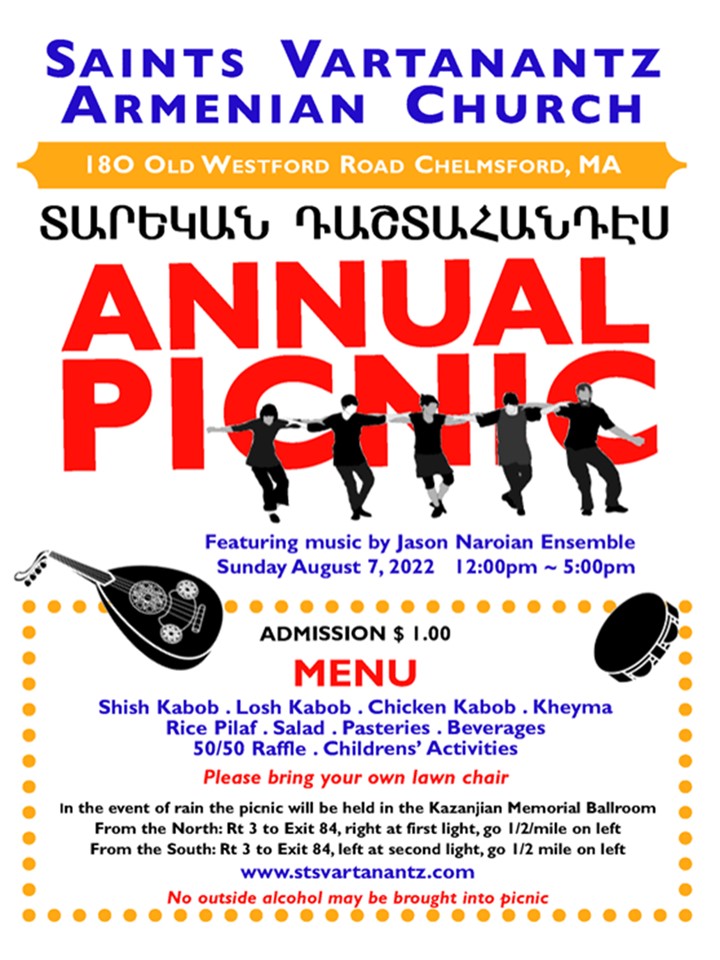 Sts. Vartanantz Church of Chelmsford, MA, will hold its annual picnic on Sunday, Aug. 7, 12-6 p.m., at the church (180 Old Westford Rd., Chelmsford). Armenian food & pastries; children’s activities; live music & dancing with to the Jason Naroian Ensemble. In the event of rain, picnic will be in the Kazanjian Memorial Ballroom. Click on the link to view a flyer.