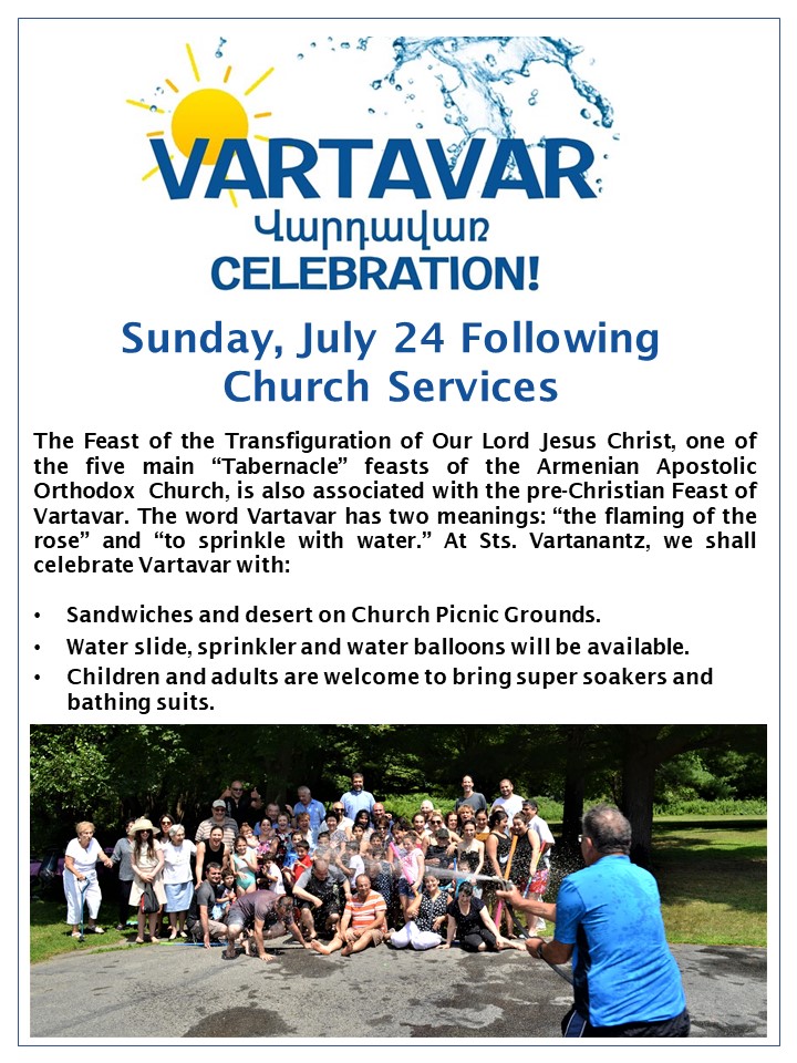 Sts. Vartanantz Church of Chelmsford, MA, will hold a Vartavar Water Festival on Sunday, July 24, following the Divine Liturgy, on the church picnic grounds (180 Old Westford Rd., Chelmsford). Food, games, and plenty of water to “shower” your friends and family. Bathing suits recommended. Click on the link to view a flyer.