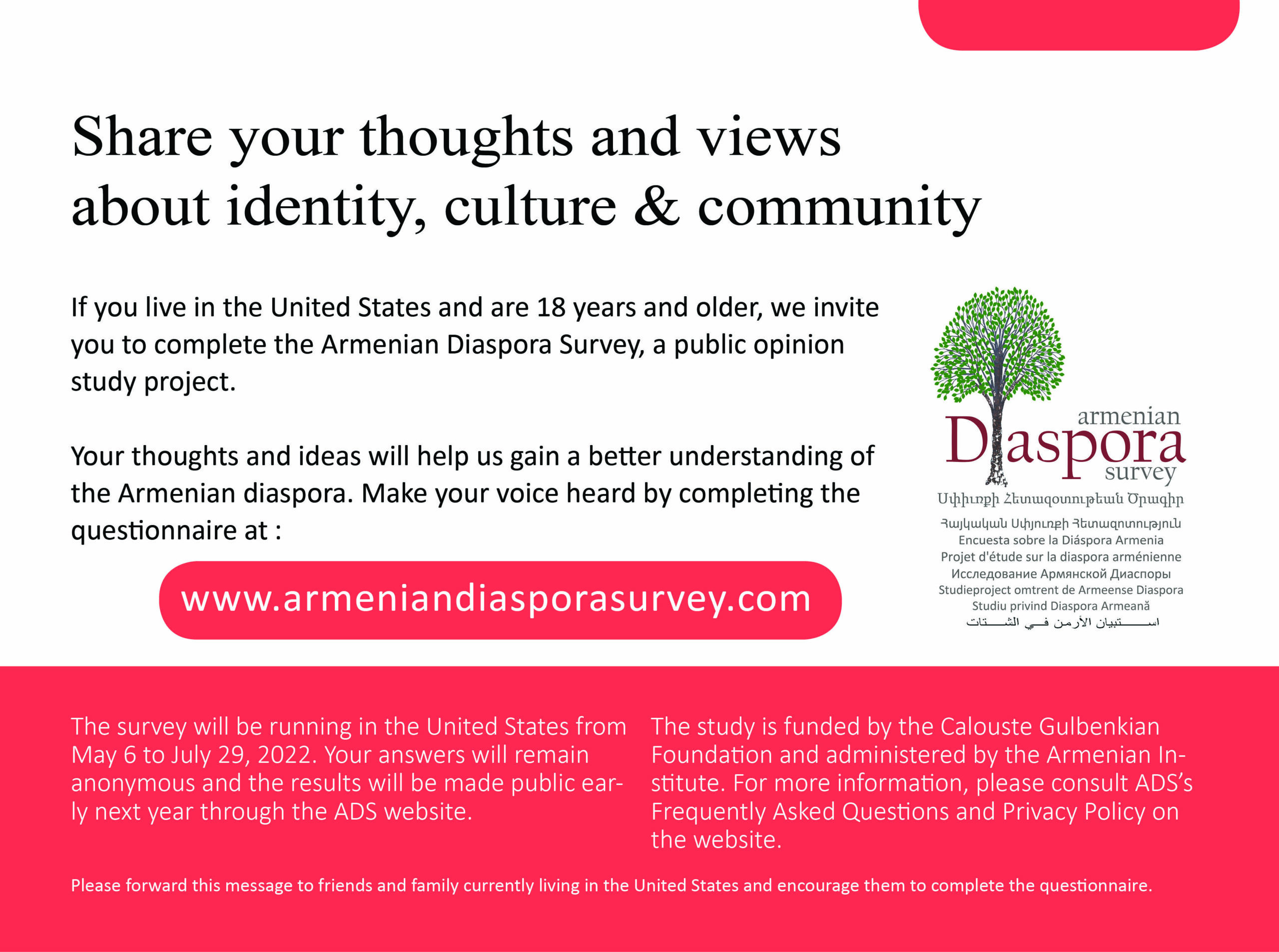 The Armenian Diaspora Survey (ADS) is a public opinion study project that launched this past spring in the United States and Canada. The study is funded by the Calouste Gulbenkian Foundation and administered by the Armenian Institute in London. The survey will be running online in the U.S. through July 29, 2022. Answers will remain anonymous and the results will be made public early next year through the ADS website. Find and complete the online questionnaire at www.armeniandiasporasurvey.com. For more information, click the following links to view a flyer and e-postcard, or consult ADS’s Frequently Asked Questions and Privacy Policy.