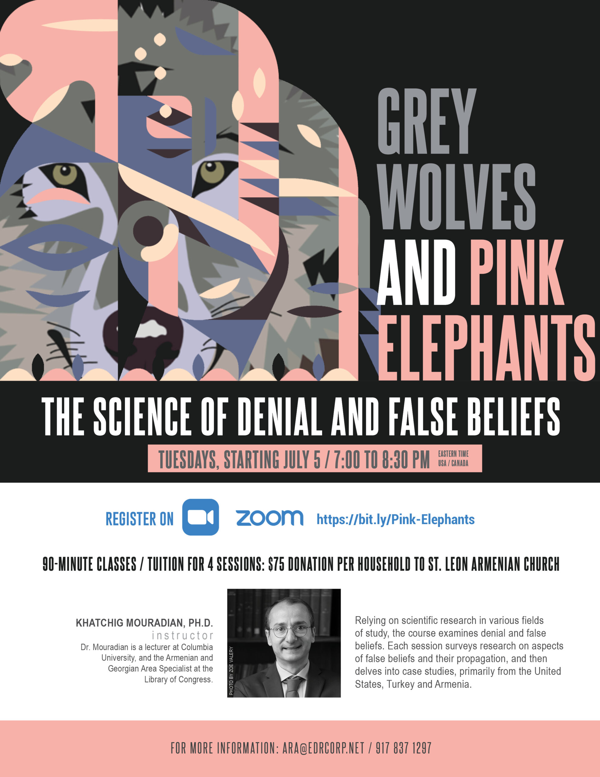 St. Leon Church (Fair Lawn, NJ) will hold a 4-session online seminar, “Grey Wolves and Pink Elephants: The Science of Denial and False Beliefs,” examining scientific research on denial and false beliefs. Prof. Khatchig Mouradian (Columbia U.) will lead the four 90-minute sessions, surveying research on aspects of false beliefs and their propagation, and delving into case studies from the U.S., Turkey, and Armenia. Classes will be held on the Zoom video conference platform at 7 p.m. EDT; the seminar meets on Tuesday evenings (July 5, 12, 19 & 26). Click the link to register for the seminar. For further details, and information on tuition, click on the link to view an informative flyer.