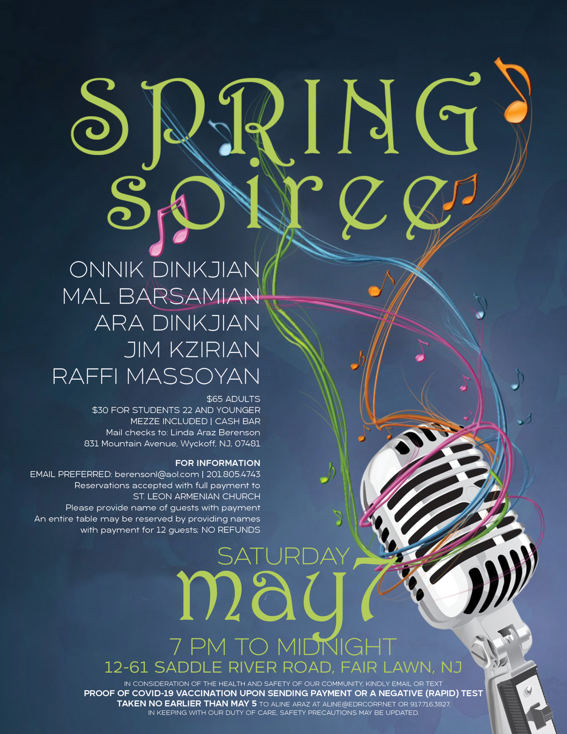 St. Leon Church in Fair Lawn, NJ, will hold a “Spring Soiree with Onnik Dinkjian,” on Saturday, May 7, at 7 p.m., at the church’s Abajian Hall (12-61 Saddle River Rd., Fair Lawn). Click the link to view a flyer with information on tickets, reservations, and more. (Proof of COVID vaccination or test required.) E-mail Linda Araz Berenson at berensonl@aol.com for details, or click here to purchase tickets online.