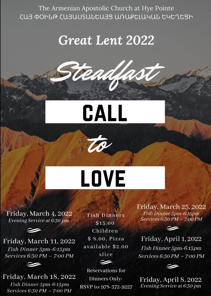 The ACYOA of Hye Pointe Church in Bradford, MA, will sponsor a Palm Sunday dinner on Sunday, Apr. 10, following services at the church (1280 Boston Rd., Bradford). RSVP (by Apr. 6) to (978) 372-9227, or armenianchurchathyepointe@verizon.net. For information visit the parish website, or click the link to view a flyer.