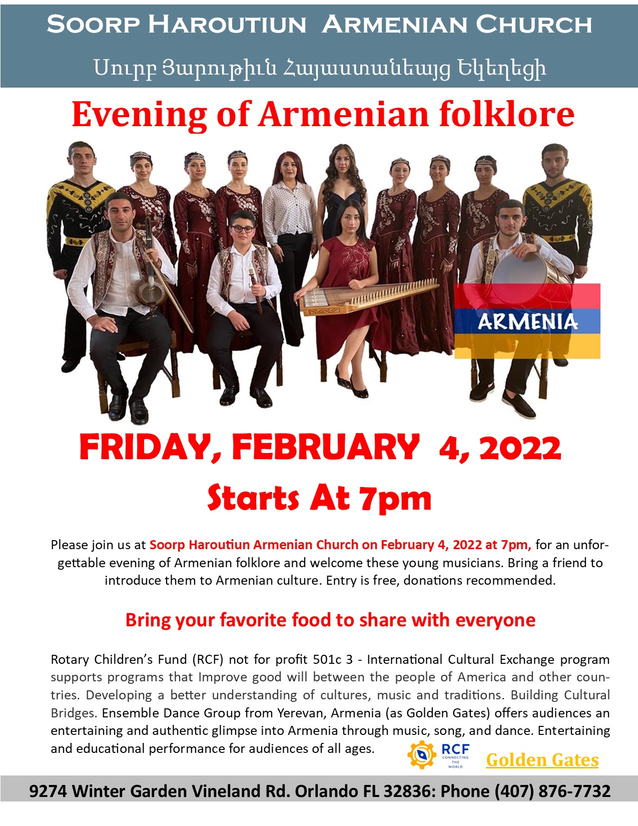 Soorp Haroutiun Church of Orlando, FL, will hold an Evening of Armenian Folklore and Music, on Friday, Feb. 4, 7 p.m., at the church facility (9274 Winter Garden Vineland Rd., Orlando). For information, click on the links to access the parish Facebook page, and to view a flyer.