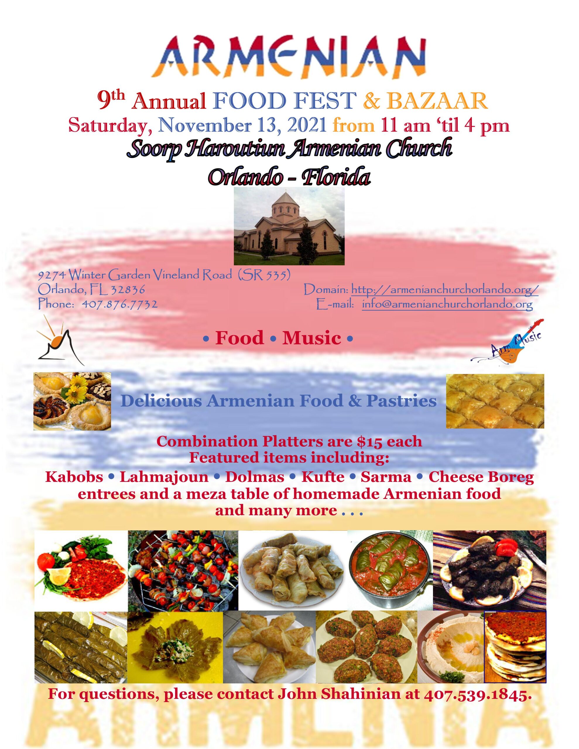 Soorp Haroutiun Church of Orlando, FL, will hold its 9th annual Food Fest and Bazaar on Saturday, Nov. 13, 11 a.m.-4 p.m., at the church facility (9274 Winter Garden Vineland Rd., Orlando). Armenian food, music, vendors. For sponsorship form, click here. For information, click on the links to access the parish Facebook page, and to view a flyer.