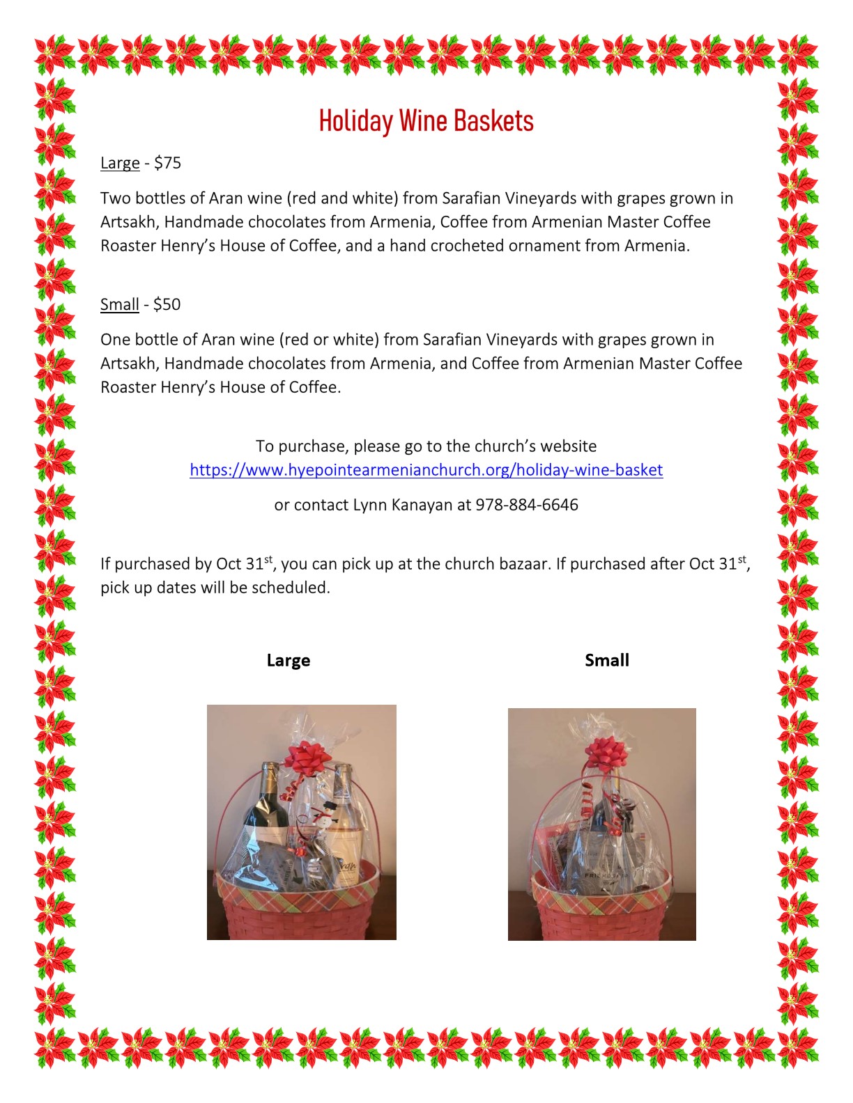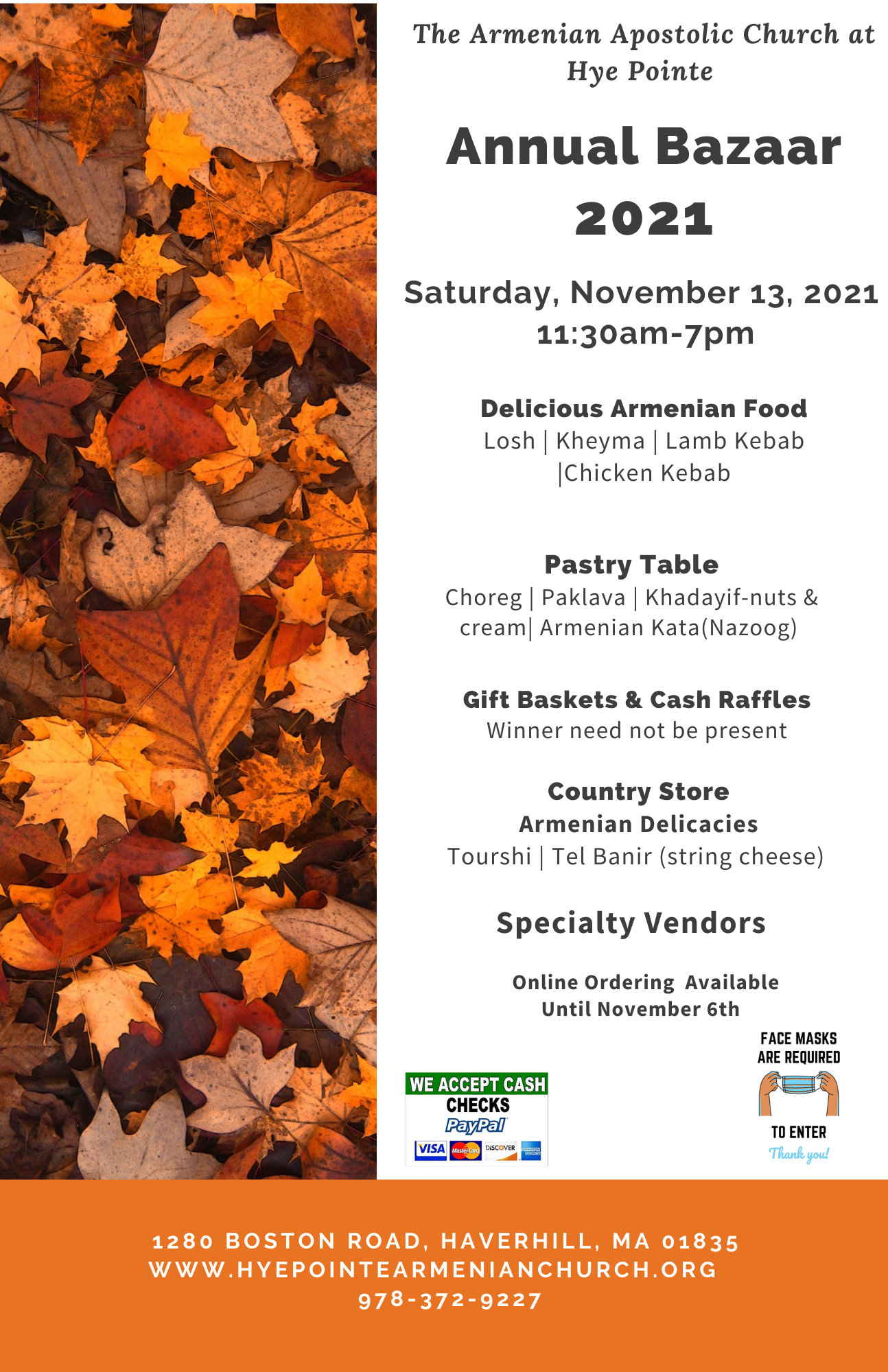 The Hye Pointe Church of Bradford, MA, will hold its annual bazaar on Saturday Nov. 13, 11:30 a.m.-7 p.m., on the church grounds (1280 Boston Rd., Bradford). Armenian cuisine and pastries, raffles, country store. Pre-order online through Nov. 6. For information visit the parish website, call (978) 372-9227, or click the link to view a flyer. Also, click the following link to download an order form for holiday baskets.