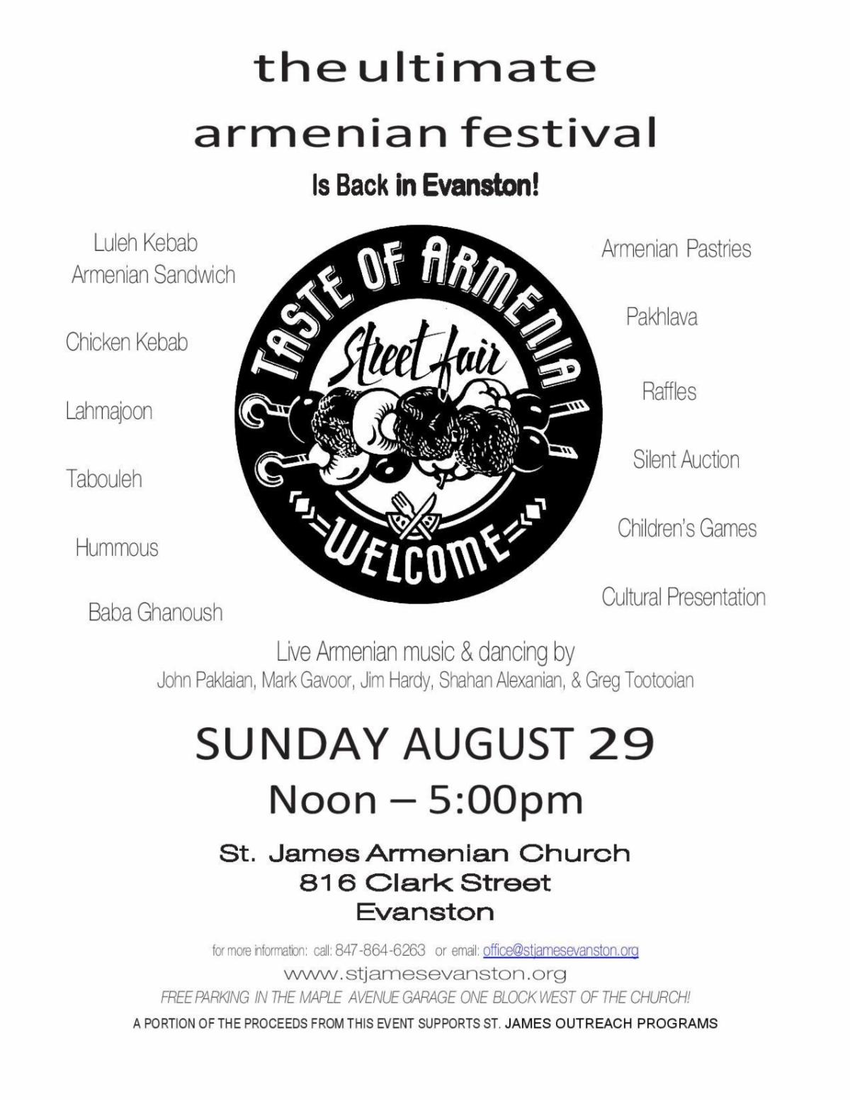 The annual “Taste of Armenia Festival” of St. James Church, Evanston, IL, will take place on Sunday, Aug. 29, 12 noon-5:00 p.m., in front of the church (located at 816 Clark St., b/n Benson and Sherman Aves., Evanston). Armenian delicacies, live music. Free admission and free parking in the Maple Street Garage. For information, click the link to view a flyer.