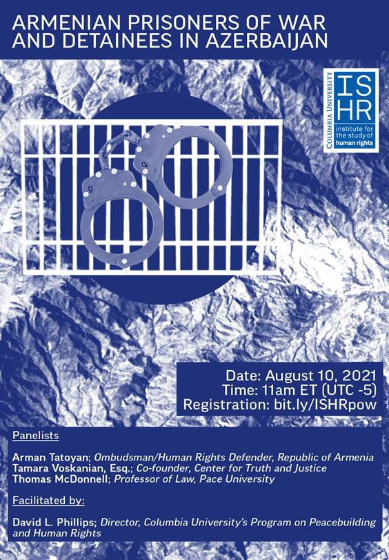 Columbia U.’s Institute for the Study of Human Rights will host an online discussion on “Armenian Prisoners of War and Detainees in Azerbaijan,” on Tuesday, Aug. 10, at 11 a.m. EDT, on the Zoom platform. Featuring Arman Tatoyan, Tamara Voskanian, Thomas McDonnell, David Phillips. Click the links to view a flyer and to register in advance.