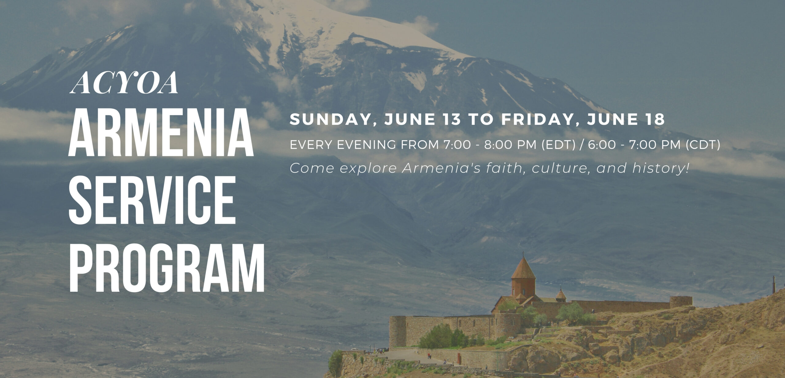The ACYOA Central Council is pleased to announce the 2021 ACYOA Virtual Armenia Service Program (ASP)—scheduled to take place from Sunday, June 13 through Friday, June 18. This year, in lieu of traveling physically to Armenia, the ACYOA has created an opportunity for Armenian youth to connect virtually while learning about their homeland. Throughout the designated week, the virtual program will meet every evening from 7 to 8 p.m. EDT (6 to 7 p.m. CDT). Participants will learn from clergy and lay leaders about different aspects of Armenia: its faith, culture, and history. The program is open to all young adults, 18 years of age and older. Click the following links to view a flyer and to register online in advance. For  information, contact the ACYOA Central Council at acyoacc@gmail.com.