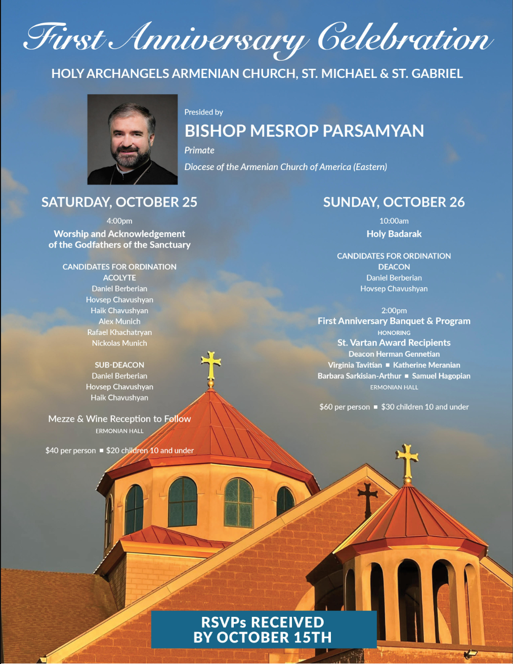 Holy Archangels Church of Haverhill, MA, will mark the first anniversary of its consecration on Saturday and Sunday, Oct. 25-26, at the church (1280 Boston Rd., Haverhill). Diocesan Primate Bishop Mesrop Parsamyan will preside, ordain altar servers, and bestow the Diocesan “St. Vartan Award” on honorees. Events begin on Saturday at 4 p.m., with a worship service and acknowledgment of church godfathers; a reception follows at 5 p.m. On Sunday the Divine Liturgy starts at 10 a.m., with a banquet and program at 2 p.m. For information call (978) 372-9227, or view a flyer. Click the following links to purchase tickets online (RSVP extended to Oct. 15), and to make a booklet donation.