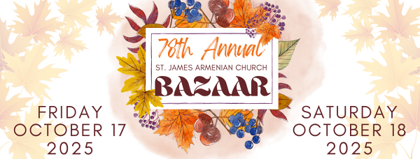 St. James Church, Watertown, MA, will hold its 78th annual Bazaar over two days: Friday, Oct. 17 (12-8 p.m.) and Saturday, Oct. 18 (11 a.m.-7 p.m.), at the church facility (465 Mt. Auburn St., Watertown). Enjoy Armenian food and pastries, raffle, silent auction, children’s activities, booths and local vendors. For information visit the parish website. To view a flyer, click here.
