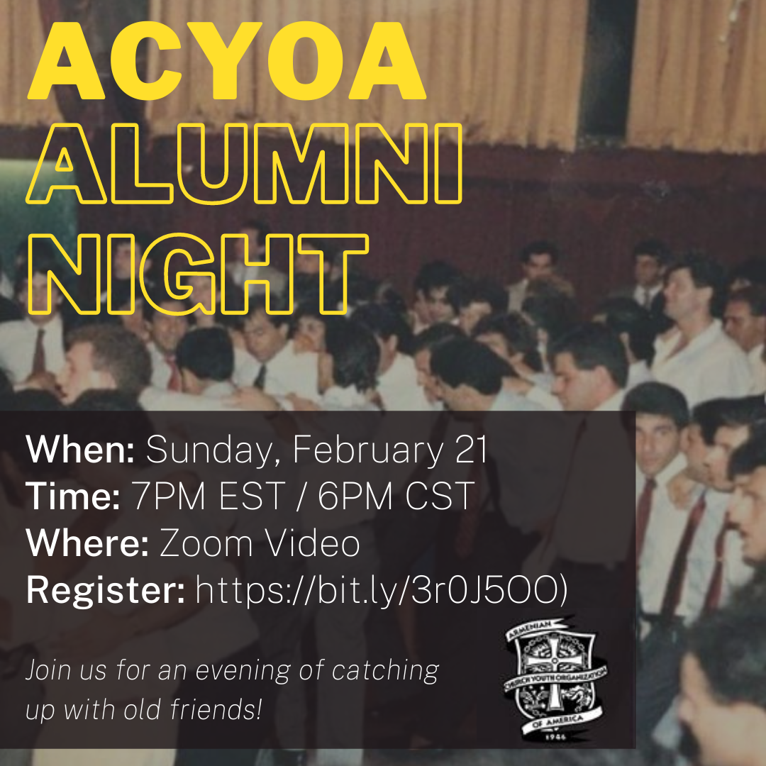In honor of the 75th anniversary of its founding, the Armenian Church Youth Organization of America is holding its first virtual ACYOA Alumni Night, billed as a trip down memory lane on the Zoom video platform. Bring your favorite memories and photos to share with contemporaries from your respective decade. It all happens on Sunday, Feb. 21, at 7 p.m. EST (6 p.m. CST). Click the links to view a flyer and to register for the virtual ACYOA Alumni Night.