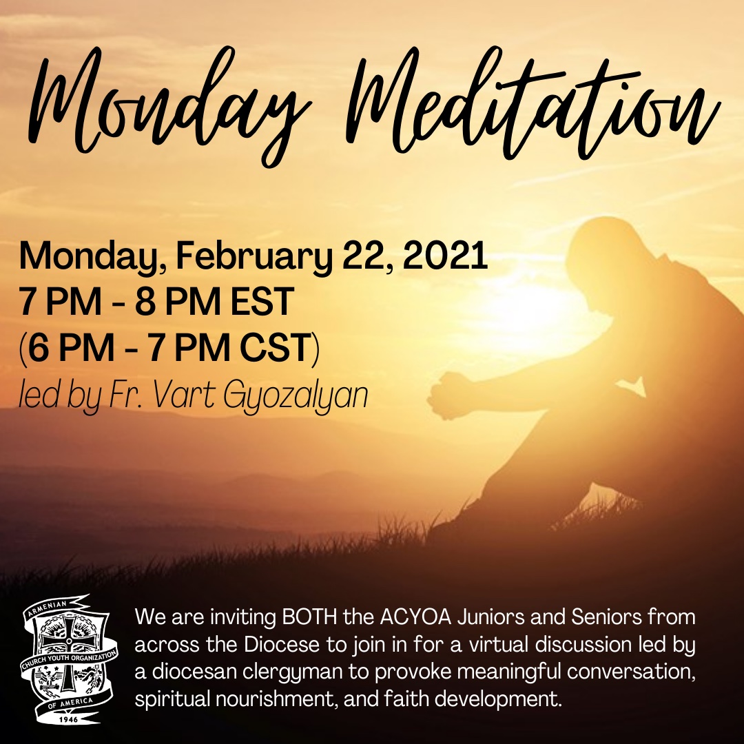The ACYOA Central Council will host the second session of its online initiative for Armenian Church youth, called “Monday Meditation,” led by Fr. Vart Gyozalyan (Hye Pointe Church, Haverhill, MA), on the evening of Monday, February 22, starting at 7 p.m. EST (6 p.m. CST). The virtual bible study session is open to ACYOA Juniors (ages 13-18) and Seniors (18 and older), and lasts between 60 and 75 minutes. Future meetings will take place on the fourth Monday of the month, over the Zoom video platform. Click on the links to view a flyer and to register for the event.