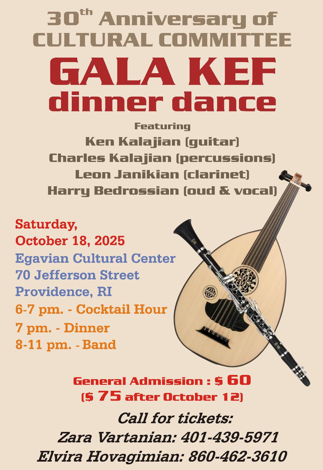 Sts. Sahag & Mesrob Church of Providence, RI, will mark the 30th anniversary of its Cultural Committee with a Gala Kef Dinner Dance, on Saturday, Oct. 18, 6-11 p.m., in the church’s Egavian Cultural Center (70 Jefferson St., Providence). To view a flyer with event, ticket, & contact details, click here.
