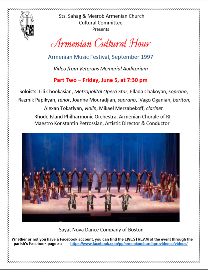 The Cultural Committee of Sts. Sahag & Mesrob Church (Providence, RI) will hold the second program in its online series, “Armenian Cultural Hour” on Friday, Jun. 5, at 7:30 p.m. The program will be part two of the 1997 Armenian Music Festival. Future programs will go live every Friday through June, at 7:30 p.m. Click the link to watch the livestream on the parish Facebook page (accessible even if you don’t have a personal Facebook account). Click the following links to view a general flyer with the upcoming schedule; and a flyer for the current program.