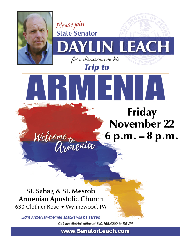 St. Sahag & St. Mesrob Church of Wynnewood, PA, will host a community-wide event on Friday, Nov. 22, at 6 p.m. Guest speaker Pennsylvania State Senator Daylin Leach will present a slide show about his recent trip to Armenia, in the church’s Memorial Hall (630 Clothier Rd., Wynnewood). Free and open to the public. For information, click on the links to view a flyer, or visit the parish website.
