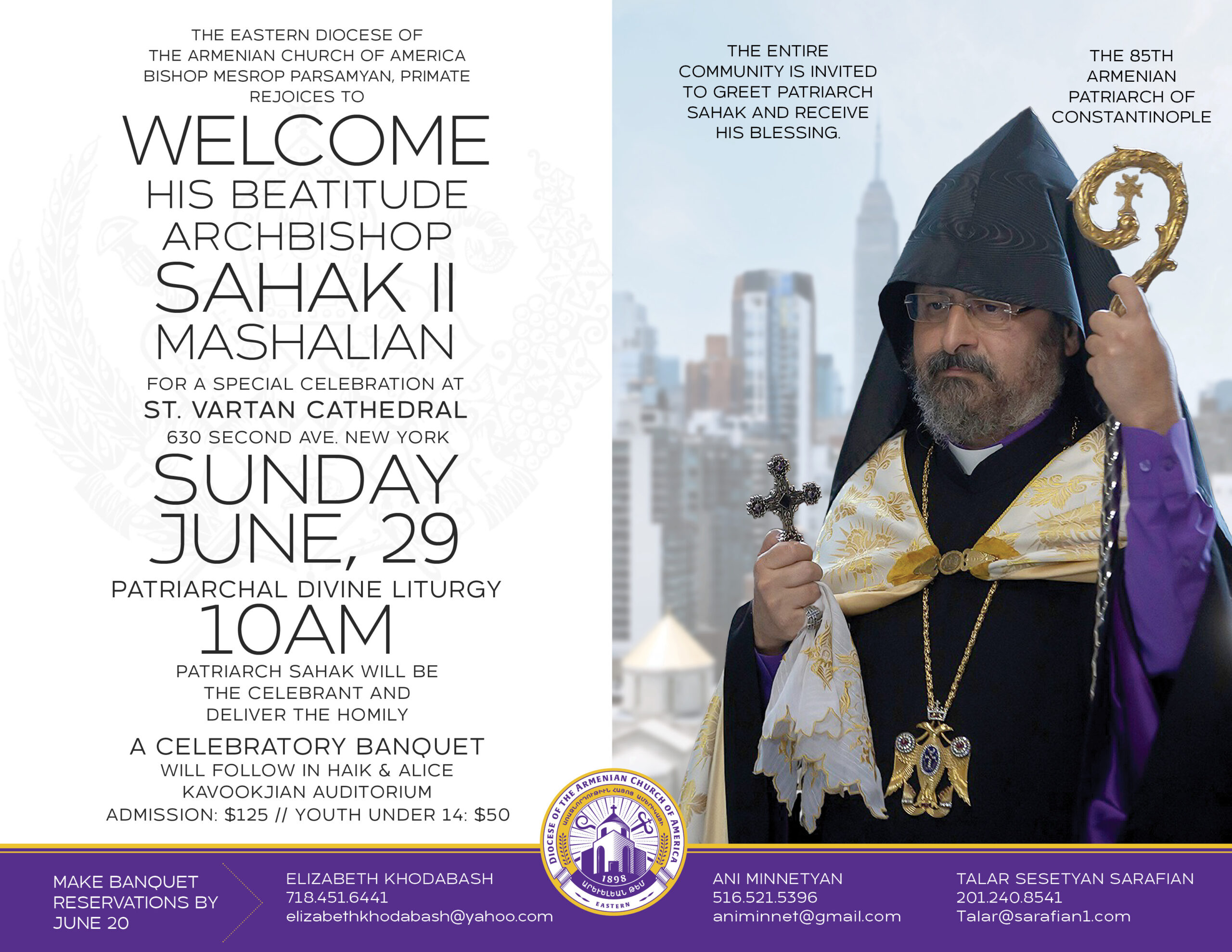 A banquet in honor of His Beatitude Archbishop Sahak II Mashalian, the Armenian Patriarch of Constantinople, will take place on Sunday, June 29, at 1 p.m., following the Patriarchal Divine Liturgy at St. Vartan Armenian Cathedral (630 Second Ave., New York City), which begins at 10 a.m. Under the auspices of Bishop Mesrop Parsamyan, Primate of the Eastern Diocese. Click the following link to view a flyer with ticket and contact information.