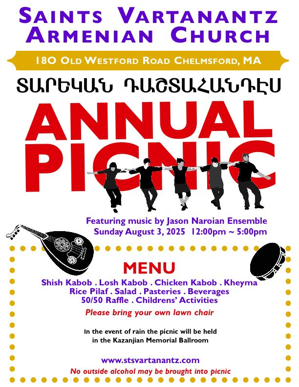 Sts. Vartanantz Church of Chelmsford, MA, will hold its annual picnic on Sunday, Aug. 3, 12-5 p.m., at the church (180 Old Westford Rd., Chelmsford). Armenian food & pastries; children’s activities; live music & dancing featuring the Jason Naroian Ensemble. In the event of rain, picnic will be in the Kazanjian Memorial Ballroom. Click on the link to view a flyer.