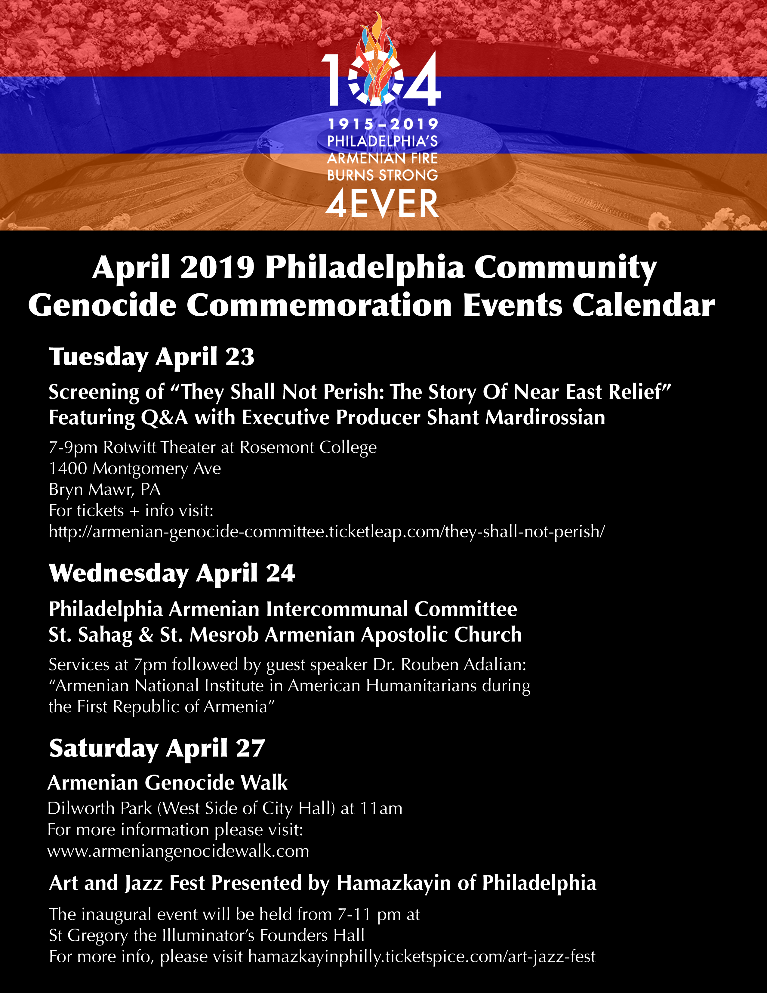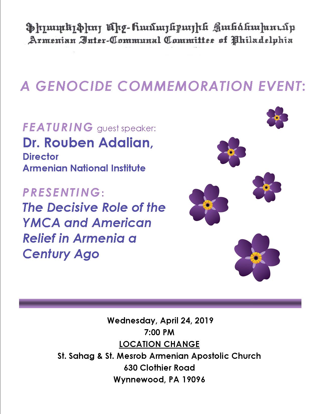 St. Sahag & St. Mesrob Church of Wynnewood, PA. will host an Armenian Inter-communal Committee of Philadelphia Genocide Commemoration. A church service at 7 p.m. will be followed by guest speaker Dr. Rouben Adalian, of the Armenian National Institute, who will speak on “The Decisive Role of the YMCA and American Relief in Armenia a Century Ago.” The event will be held in the church’s Memorial Hall (630 Clothier Rd., Wynnewood) on Wednesday, Apr. 24, at 7 p.m. Free and open to the public; for information click here to view a flyer. To view a flyer listing additional Philadelphia-area commemorative events, click here.
