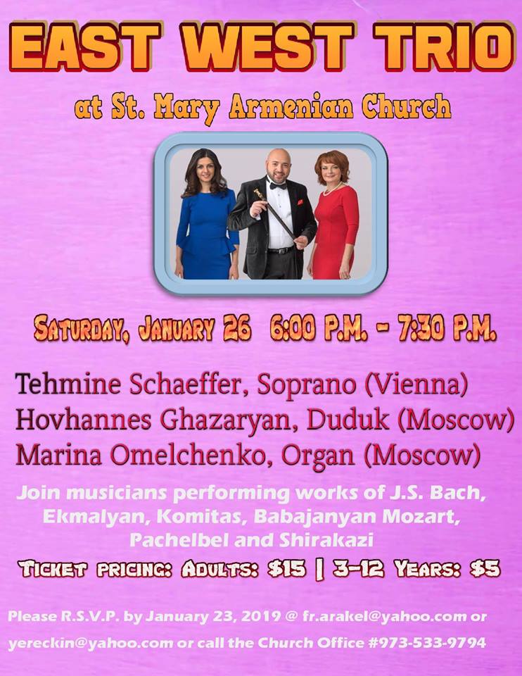 St. Mary Church of Livingston, NJ, will present a concert by the “East West Trio,” on Saturday, Jan. 26, at 6 p.m., at the church (200 W. Mt. Pleasant Ave., Livingston). Featured performers Tehmine Schaeffer (soprano), Hovhannes Ghazaryan (duduk), Marina Omelchenko (organ) will perform works by Bach, Yegmalian, Gomidas, Babajanyan, Mozart, Pachelbel, Shirakatzi (view a promo video here). For ticket details, click on the links to visit the parish website or to view a flyer. To reserve (by Jan. 23) call the church office at (973) 533-9794.