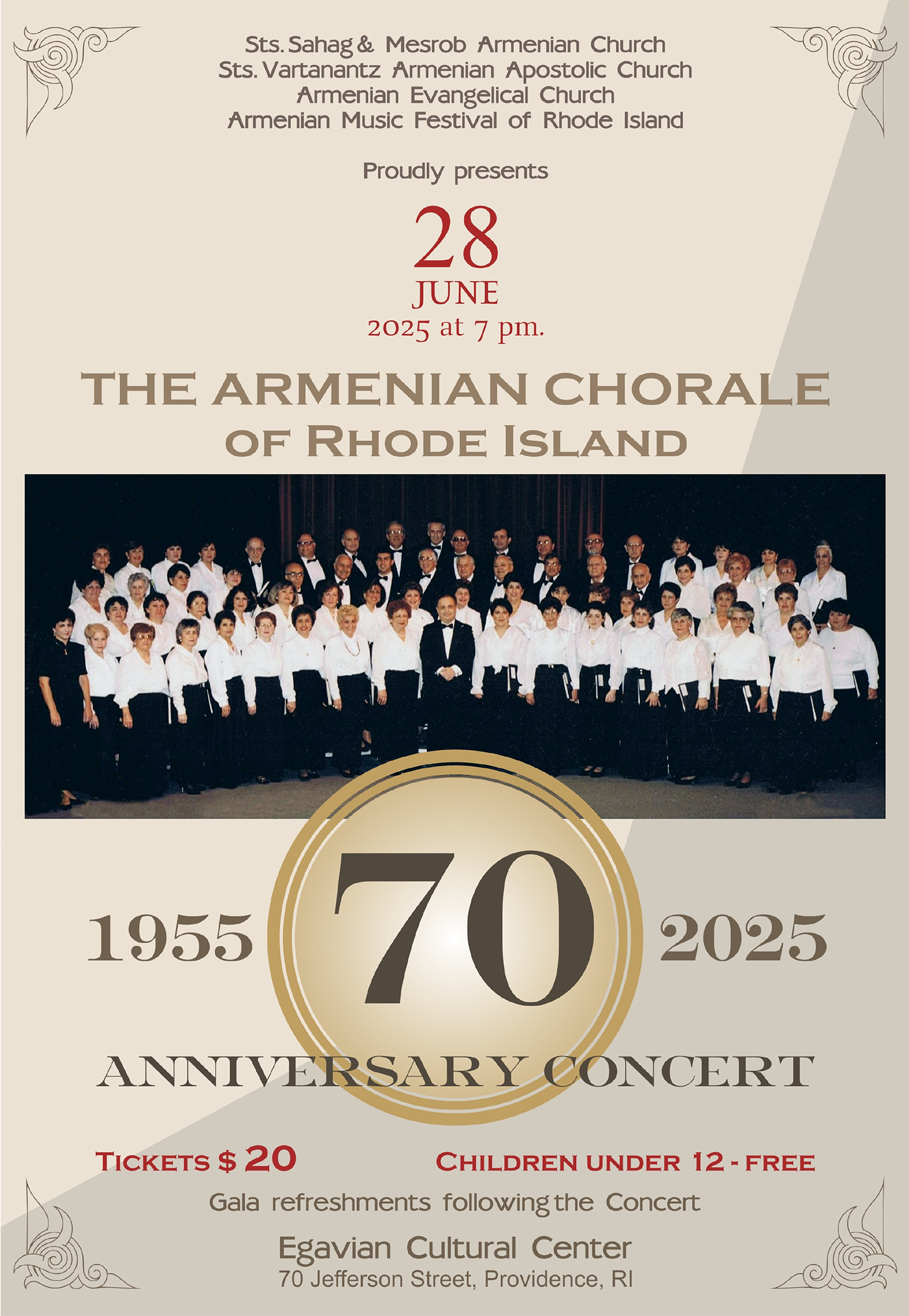 Sts. Sahag & Mesrob Church of Providence, RI, will host the 70th Anniversary Concert of the Armenian Chorale of Rhode Island, on Saturday, Jun. 28, at 7 p.m., in the church’s Egavian Cultural Center (70 Jefferson St., Providence). To view a flyer, click here.