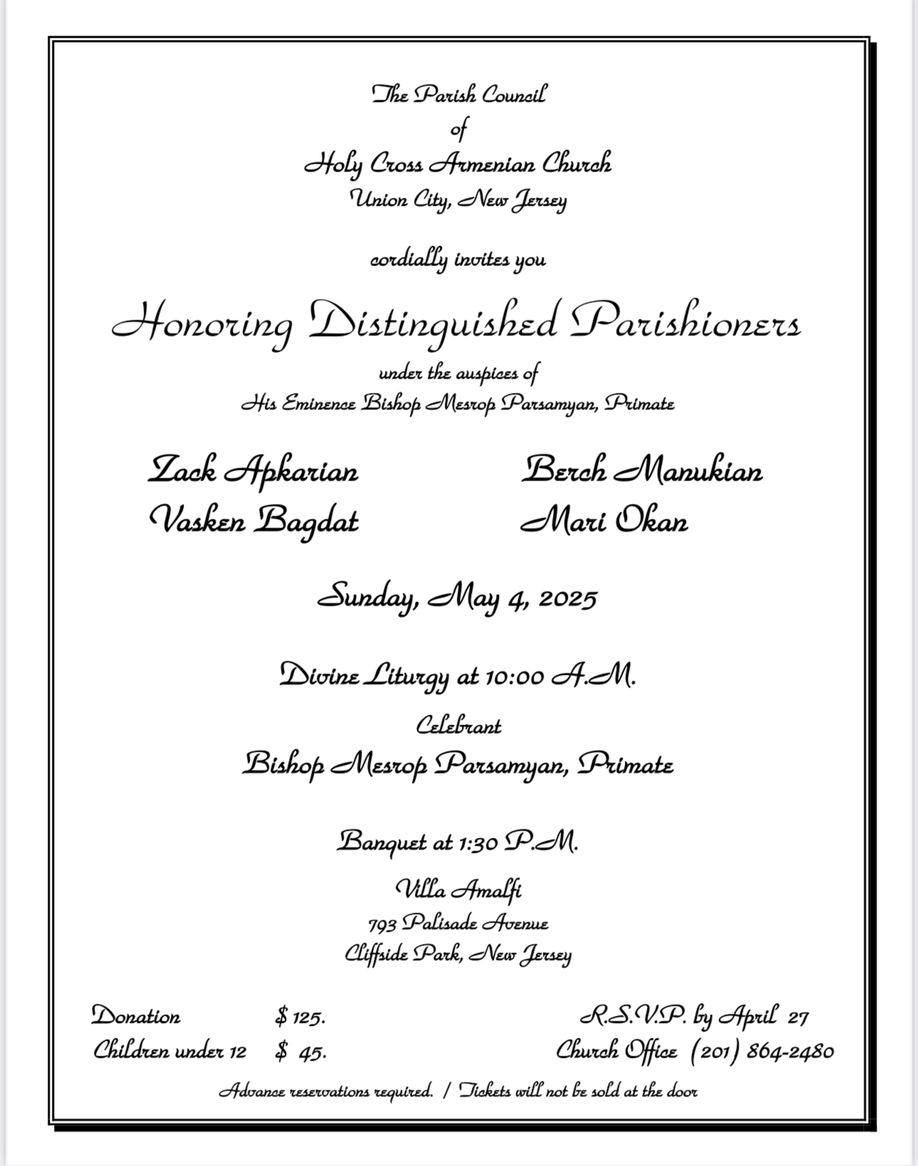 Holy Cross Church of Union City, NJ, will welcome Diocesan Primate Bishop Mesrop Parsamyan to preside over a tribute banquet on Sunday, May 4, at Villa Amalfi (793 Palisade Ave., Cliffside Park), at 1:30 p.m. Event follows Episcopal Divine Liturgy at the church (318 27th St., Union City), starting at 10 a.m. Parishioners Zack Apkarian, Vasken Bagdat, Berch Manukian, Mari Okan to be honored. RSVP (by Apr. 27) required; to reserve call the church office at (201) 864-2480. To view a flyer, click here.