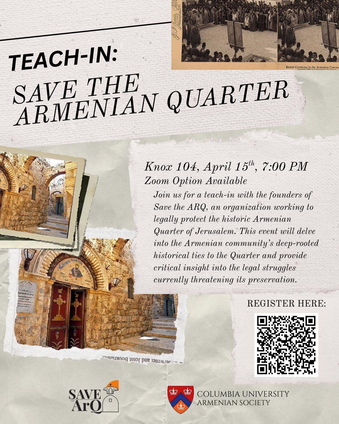 On April 15th at 7:00 PM EST, Armenian Society of Columbia University will be hosting a special teach-in about about Save the ARQ’s work to legally protect the historic Armenian Quarter of Jerusalem. Hear directly from the founders of Save The ArQ and learn how you can get involved in this crucial effort to safeguard the 1,700-year-old Armenian presence in Jerusalem. To register for the event, (either online or in-person,) click here. To view a flyer, click here.