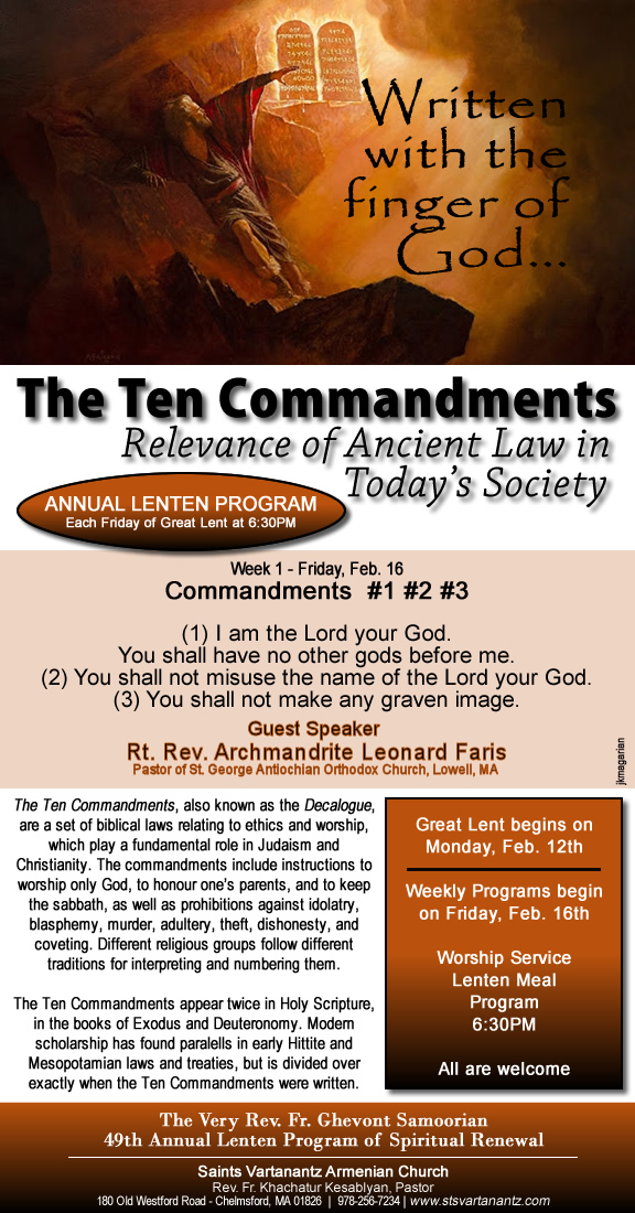 Sts. Vartanantz Church of Chelmsford, MA, will begin its 49th season of Friday-evening Lenten programs–the “V. Rev. Fr. Ghevont Samoorian Lenten Program of Spiritual Renewal”–on Friday, Feb. 16, at 6:30 p.m. at the church (180 Old Westford Rd., Chelmsford). The first lecture is titled “The Ten Commandments: Relevance of Ancient Law in Today’s Society”; the schedule will encompass all six Friday evenings of Lent, with opportunities to gather for worship, share a Lenten meal, and hold discussions to encourage spiritual examination, understanding, and renewal. Area guest clergy and others will present on selected commandments. Open to the public; for information click on the links to view a flyer and log onto the parish website.