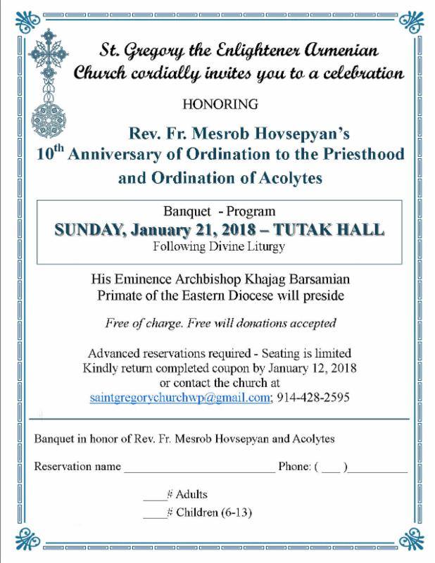 St. Gregory the Enlightener Church of White Plains, NY, will celebrate the 10th ordination anniversary of pastor Rev. Fr. Mesrob Hovsepyan with a banquet on Sunday, Jan. 21, at 1 p.m., in the church’s Tutak Hall (1131 North St., White Plains). Diocesan Primate Abp. Khajag Barsamian will preside. Event will follow badarak; the Primate will be celebrant and perform ordinations and special blessings. Reservations required; click on the link to view a flyer with RSVP and ticket information.