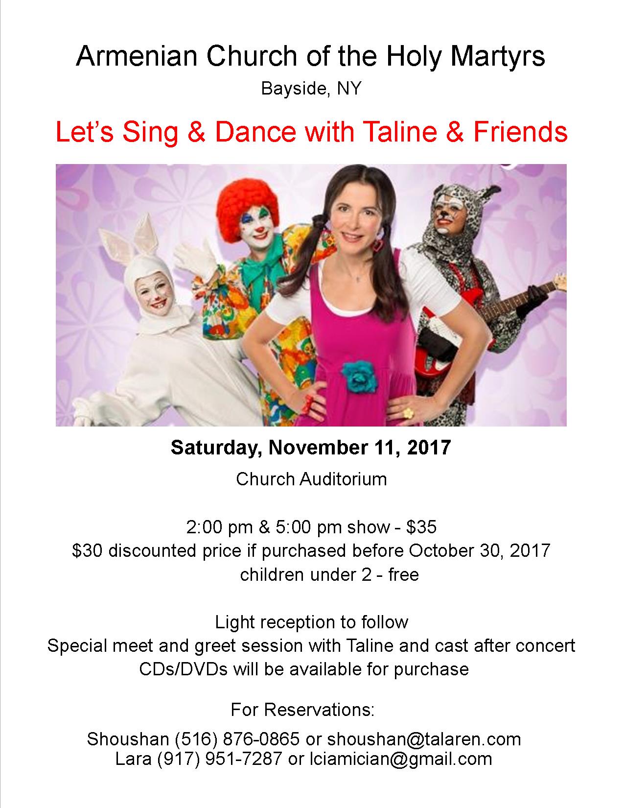 Holy Martyrs Church of Bayside, NY, will welcome back entertainer Taline for a children’s program, “Let’s Sing & Dance with Taline & Friends,” performed twice on Saturday, Nov. 11; showtimes are 2 p.m. and 5 p.m. in the church hall (20915 Horace Harding Expy., Bayside). For information on purchasing tickets and reservation contact numbers, click on the link to view a flyer.