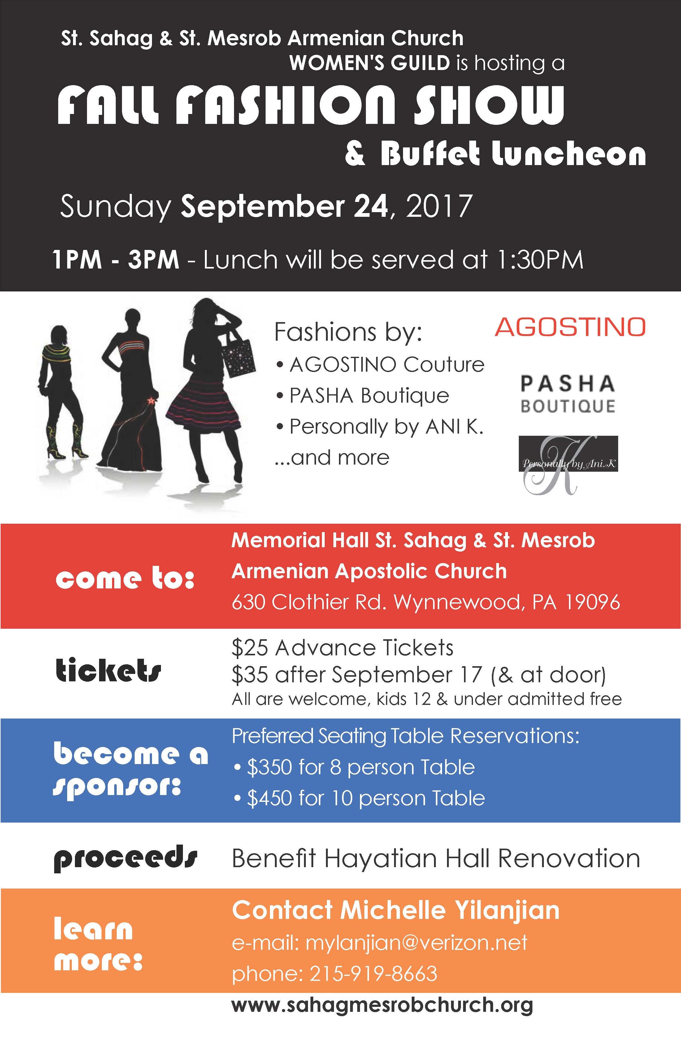 The Women’s Guild of St. Sahag and St. Mesrob Church of Wynnewood, PA, will hold its “Fall Fashion Show and Buffet Luncheon” on Sunday, Sep. 24, 1-3 p.m., in the church hall (630 Clothier Rd., Wynnewood, PA). For ticket, sponsorship, and general information call (215) 919-8663, or click here to view a flyer.