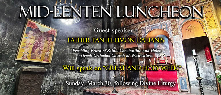 St. John the Baptist Church of Metro Milwaukee, WI, will hold a Mid Lenten (Mitchink) luncheon on Sunday, Mar. 30, following services at the church (7825 W. Layton Ave., Greenfield). Fr. Panteleimon Dalianis, of Sts. Constantine and Helen Greek Orthodox Church of Wauwatosa, will speak on “Great and Holy Week.” For information, click the following link to access the parish website.