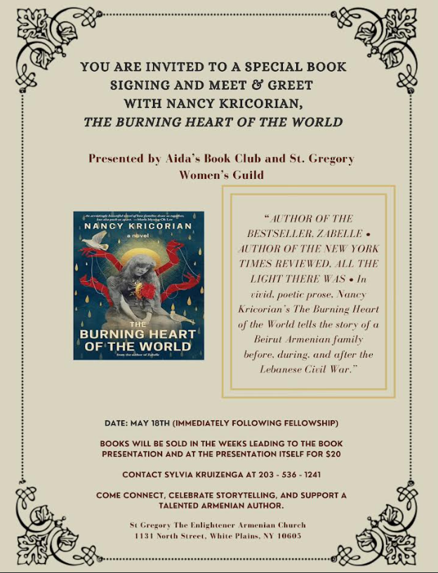 St. Gregory the Enlightener Church Womens’ Guild will be hosting Nancy Kricorian with a book signing on May 18, after church service, at St. Gregory Armenian Church. Nancy Kricorian’s novel, The Burning Heart of the World, tells the powerful story of a Beirut Armenian family before, during, and after the Lebanese Civil War. Copies of the book will be available for purchase at the signing. For information contact Sylvia Kruizenga at (203) 536-1241. For details, click the link to view a flyer.