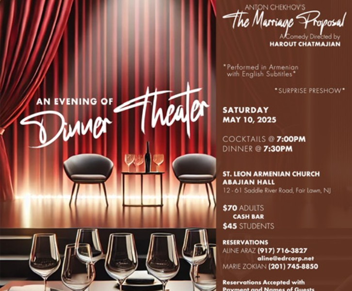 St. Leon Armenian Church and Tekeyan Cultural Association Mher Megerdchian Theatrical Group present an evening of Dinner Theater, featuring Anton Chekhov’s “The Marriage Proposal” – a comedy directed by Harout Chatmajian. Performed in Armenian with English Subtitles. Surprise Preshow. Saturday, May 10, 2025. Cocktails at 7PM Dinner at 7:30PM. For reservations and more information, please contact: Aline Araz 917-716-3827 aline@edrcorp.net. Click here to view a flyer.
