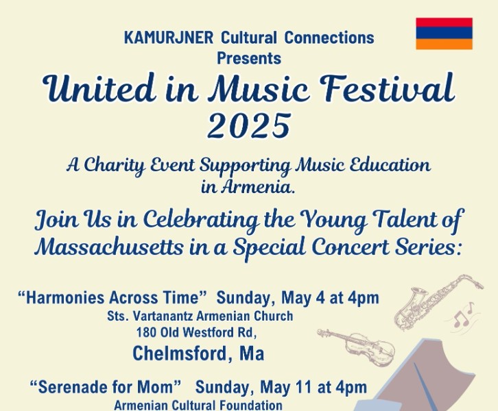 The St. Vartanantz Armenian Church, in partnership with KAMURJNER Cultural Connections, invites you to attend and support a Charity Concert Series Celebrating the Young Talent of Massachusetts. All proceeds will benefit music education in Armenia’s suburban areas. Day 1 is titled “Harmonies Across Time,” and will premiere on Sunday, May 4th at 4pm. To view a flyer for more information, click here.