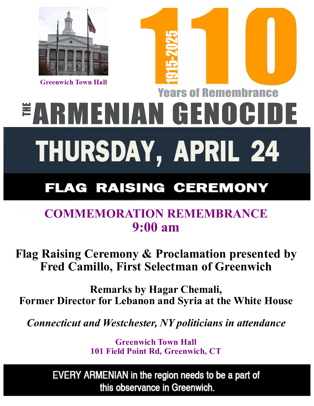 St. Gregory the Enlightener Church (White Plains, NY) invites the public to attend the Armenian Genocide Commemoration/Remembrance and Flag-Raising Ceremony at Greenwich Town Hall (101 Field Point Rd., Greenwich, CT) on Thursday, Apr. 24, at 9 a.m. Proclamation presented by town selectman Fred Camillo, w/other Connecticut and Westchester politicians attending. Remarks by Hagar Chemali, former White House director for Lebanon and Syria. To view a flyer with information, click here.