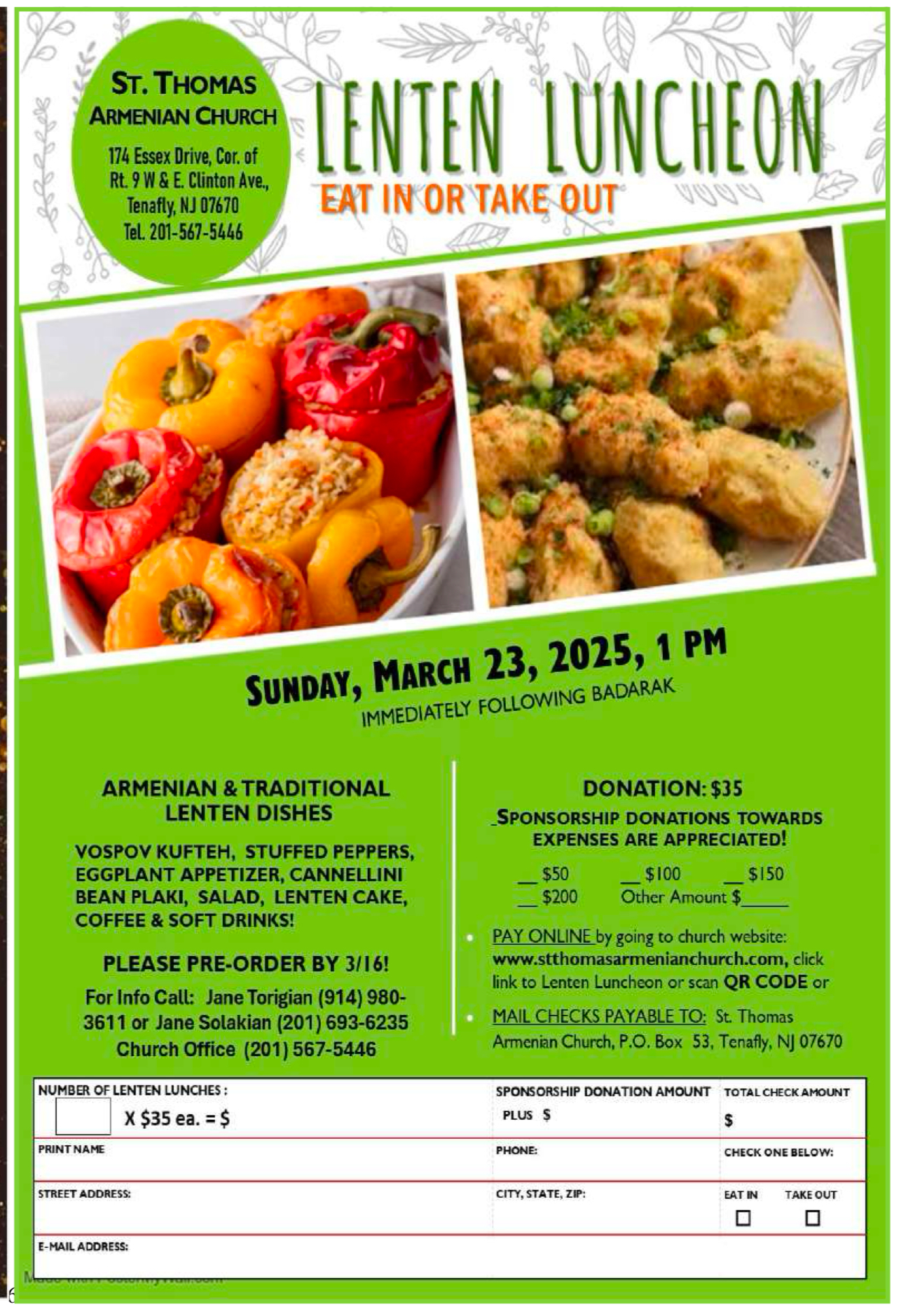 St. Thomas Church of Tenafly, NJ, will hold a Lenten luncheon on Sunday, Mar. 23, following the celebration of the Divine Liturgy, at the church (174 Essex Dr., Tenafly). Eat in or take out; sponsorships appreciated. Click here for a flyer with information.