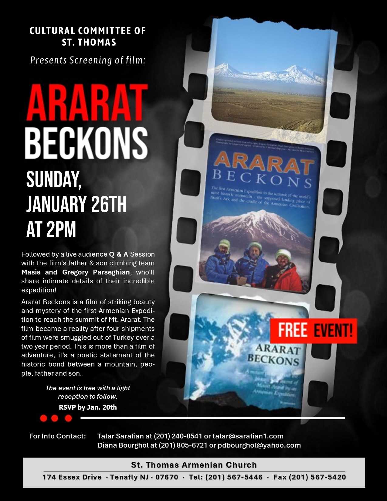 The Cultural Committee of St. Thomas Church in Tenafly, NJ, will screen the film Ararat Beckons on Sunday, Jan. 26, at 2 p.m., at the church (174 Essex Dr., Tenafly). In a live audience Q&A session to follow, the film’s father and son climbing team, Masis and Gregory Parseghian, will share details of their expedition. Admission is free; a light reception will follow. For information, and to RSVP (by Jan. 20) e-mail talar@sarafian1.com, or pdbourghol@yahoo.com. Click the link to view a flyer.